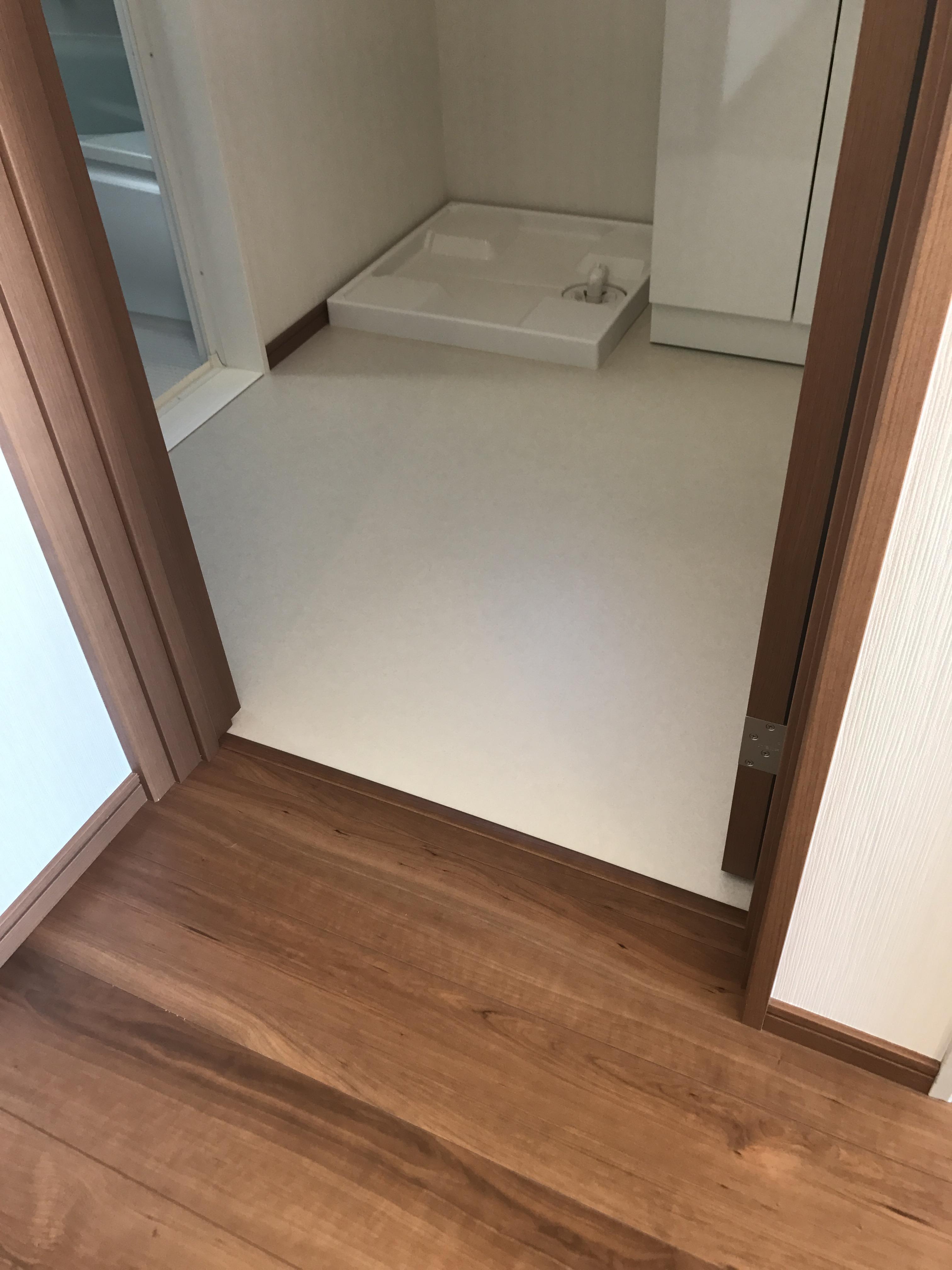 洗面台の大きさも今と同じの幅60cmです。 今主流の洗髪できるシャワー水栓仕様です。 収納量を少しでも増やすため、鏡は開閉式で収納できるタイプです。 洗濯機を置く洗濯機パンと洗濯機水栓も新調しました。 また、洗濯機前の窓サッシもペアガラス仕様に取り替えしています。 洗面室の暖房機も新設しました。 冬は暖房機として、夏は涼風の出る扇風機代わりとしてお使いいただけます。 廊下からは段差無しで出入り出来るように、バリアフリー仕様にしております。