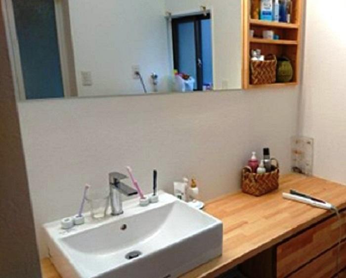 洗面所の改装工事をおこないました。洗面所を広く使いたいのとウッド調のやさしい雰囲気にするのがご希望でした。入口が2つあったので1つを壁にして洗面台を広くしました。洗面台はウッドで造作し表面をクリア塗装しています。雰囲気ががらっと変わりましたね♪