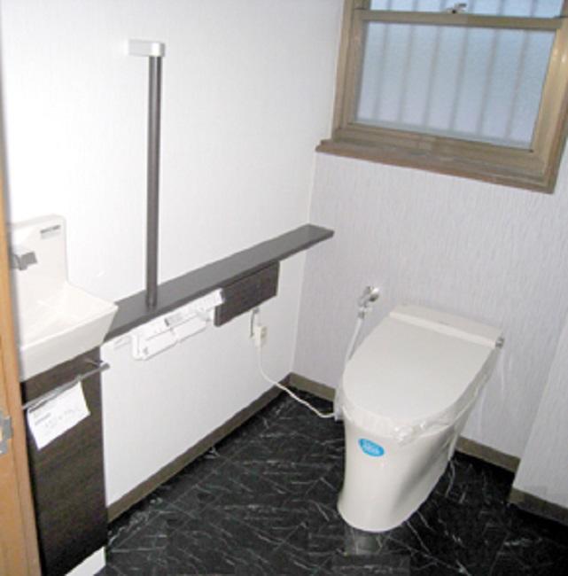 トイレの改装工事をおこないました。タンクレス便器、カウンター手摺、手洗い付です。タンクレス便器はコンパクトなので、トイレスペースが広く使え、気持ちの余裕も生まれます。カウンターは、ちょっとした飾り棚として、又 立ち座りの補助にもなります。手摺もついているので、安心ですね。手洗いが別についているので、周囲の水はねでの汚れ等お手入れも楽々です。当然 節水 省エネタイプ。訪れるお客様にも きれいに使って頂けそうです。