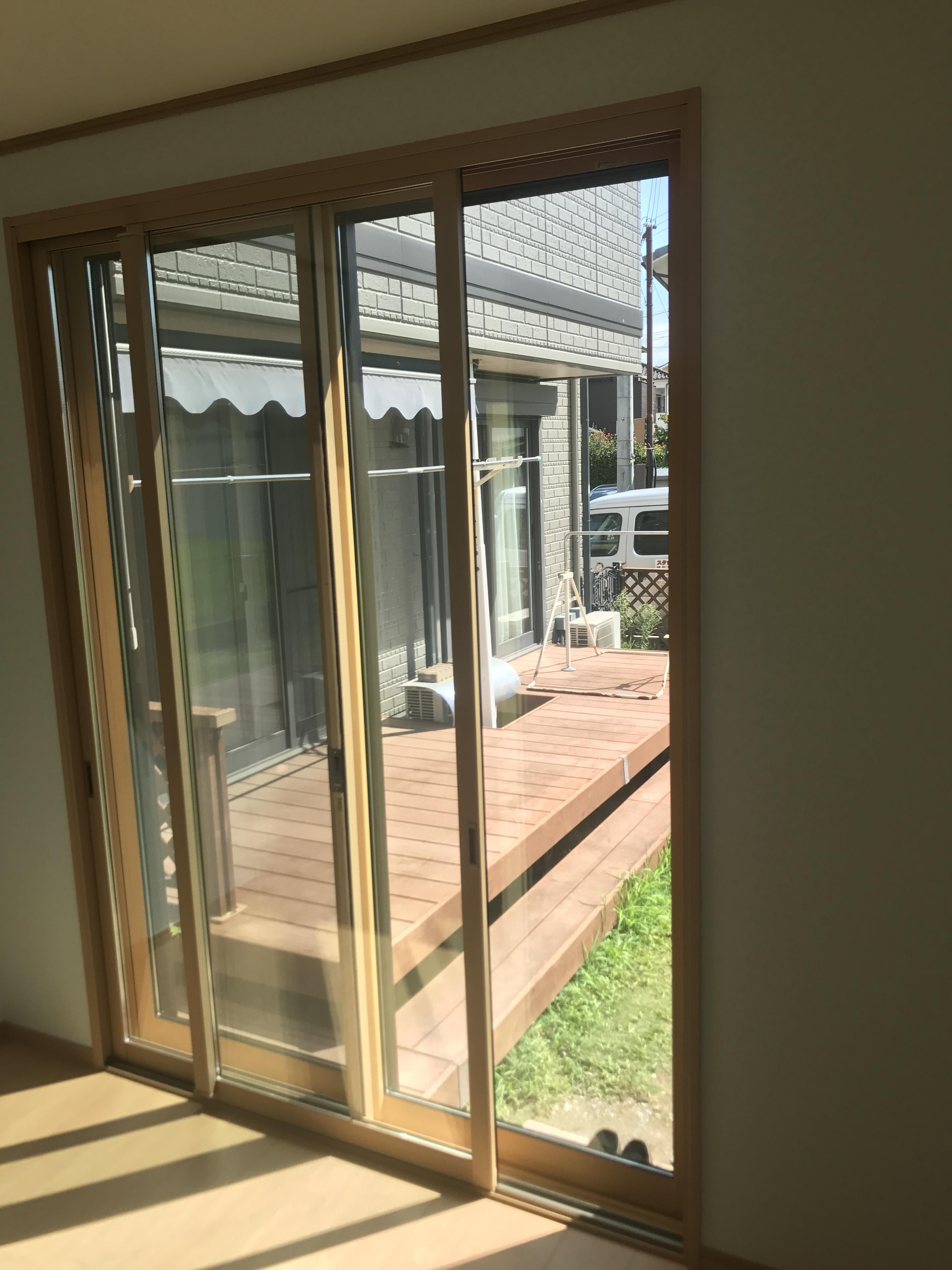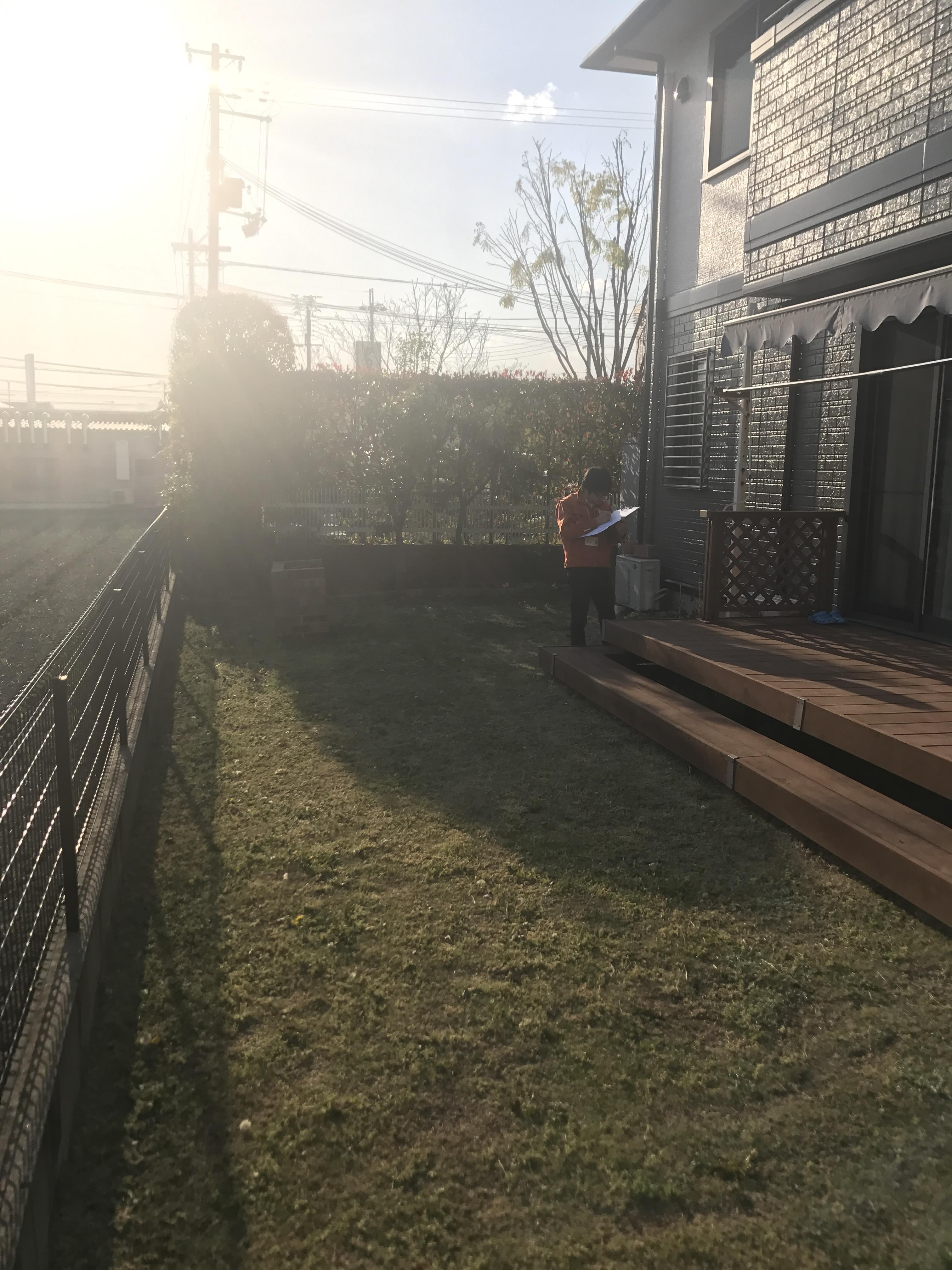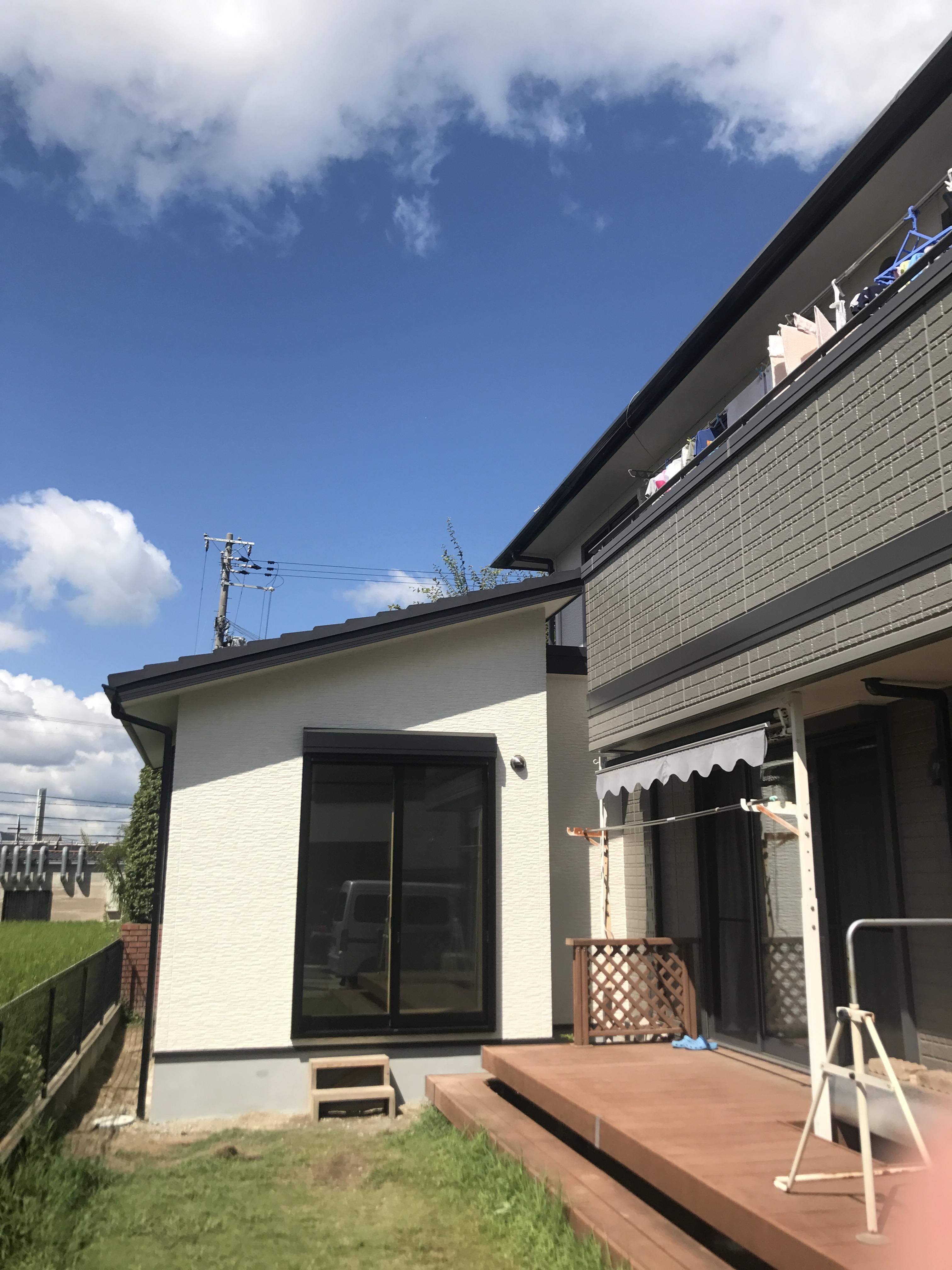 娘様がピアノを練習するための部屋を増築しました。今まではリビング隣の和室で練習していたのですが、やはり音も気になるので、少し離れたところで練習できるように、とのご要望でした。写真のウッドデッキの向こう側(設計担当の石堂が立っているあたり)のスペースを使って増築することにしました。片流れ屋根の部屋を作って、渡り廊下でつなぎました。ピアノの音が外に漏れにくいように、サッシは二重にしています。渡り廊下部分は、収納棚として活用しています。音を気にせず、集中して練習できる部屋が出来ました。