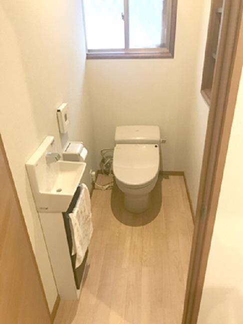 トイレの改装工事をおこないました。お客様からのご要望としては・壁、天井をクロスに変更・床のクッションフロア張替え・大便器はまだ新しいので脱着して再利用したい・小便器は使わないので撤去し、その分トイレを小さくしてほしい・手洗い器は新調 でした。小便器を撤去し、掃除のしやすいコンパクトなトイレに改装しました。壁をクロス壁にしただけで、とても明るく清潔感のあるトイレになりました。