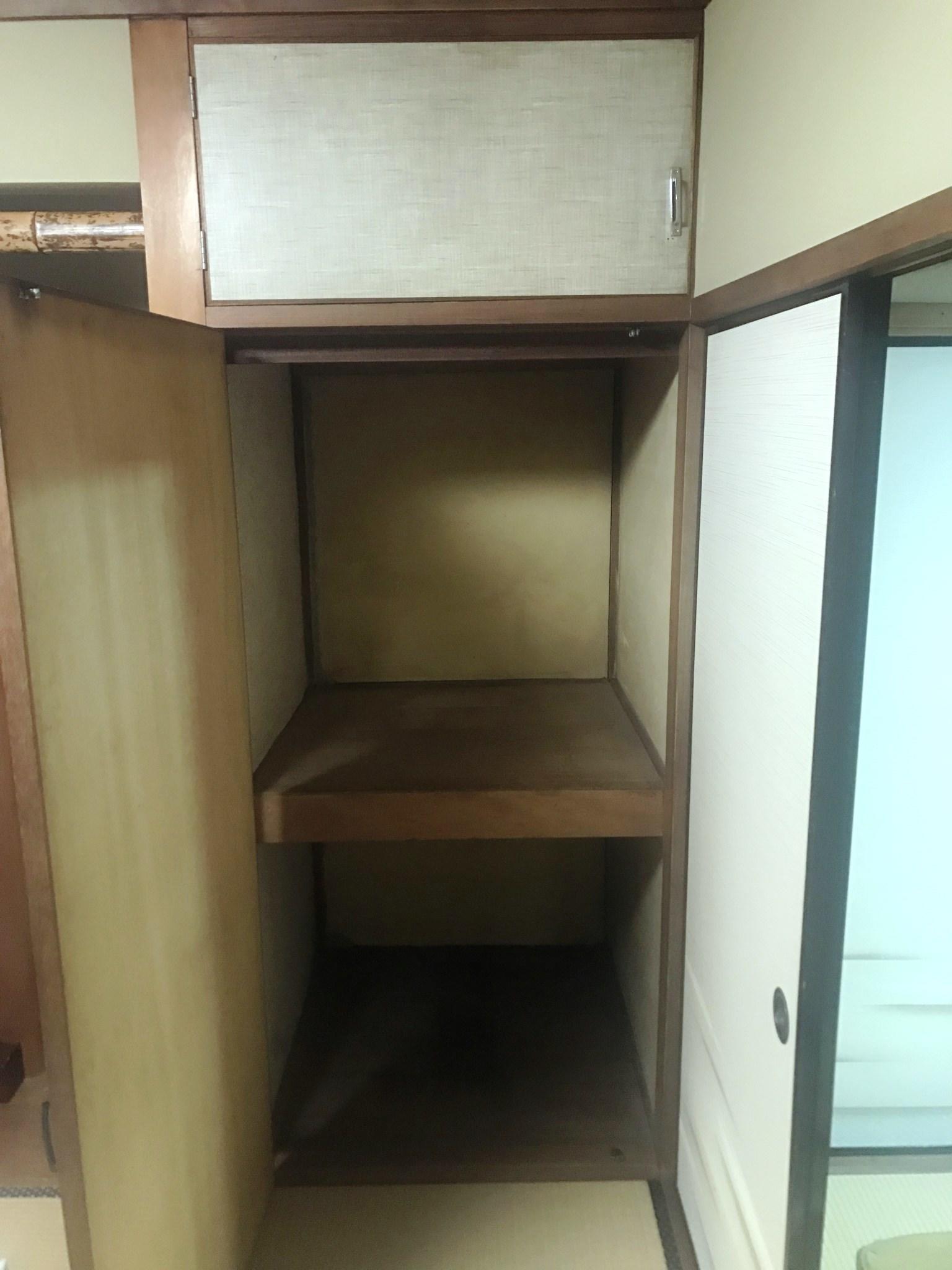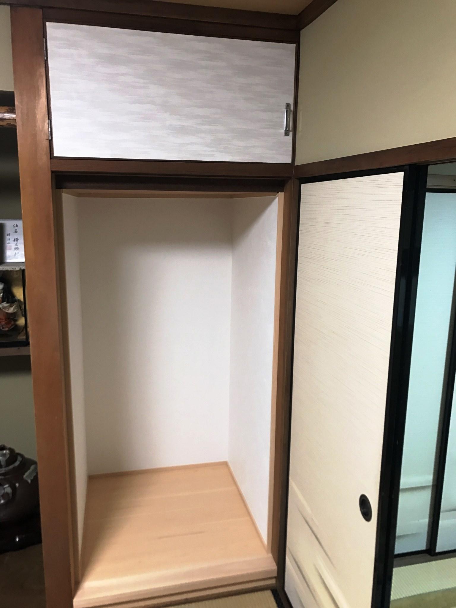 お仏壇を置くスペースが必要になり、和室の押し入れを仏間に改装しました。工事前の押し入れは、ごく一般的な半畳の押し入れです。この古い押入れのふすまを外し、中段を撤去して、桧の床とクロスで造作しました。