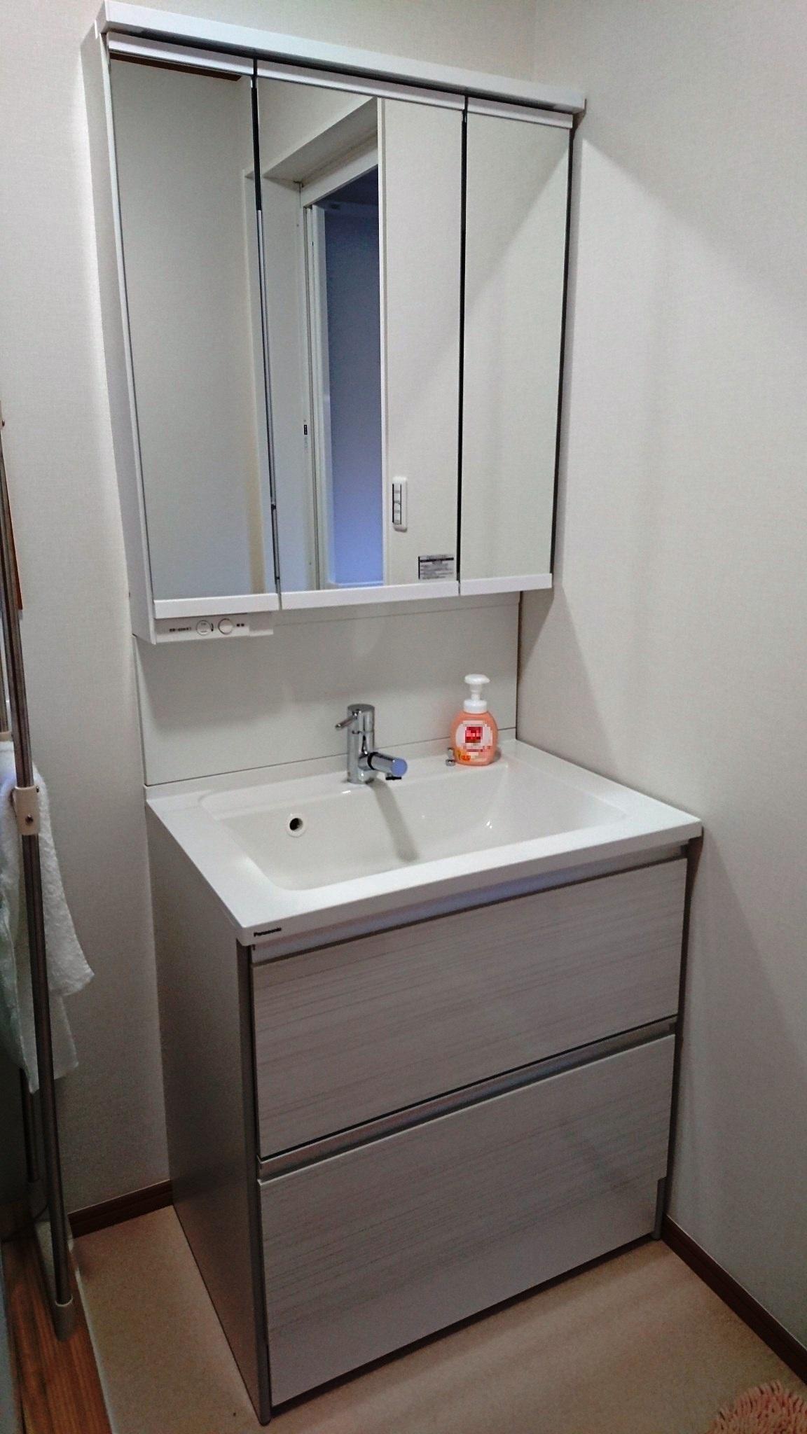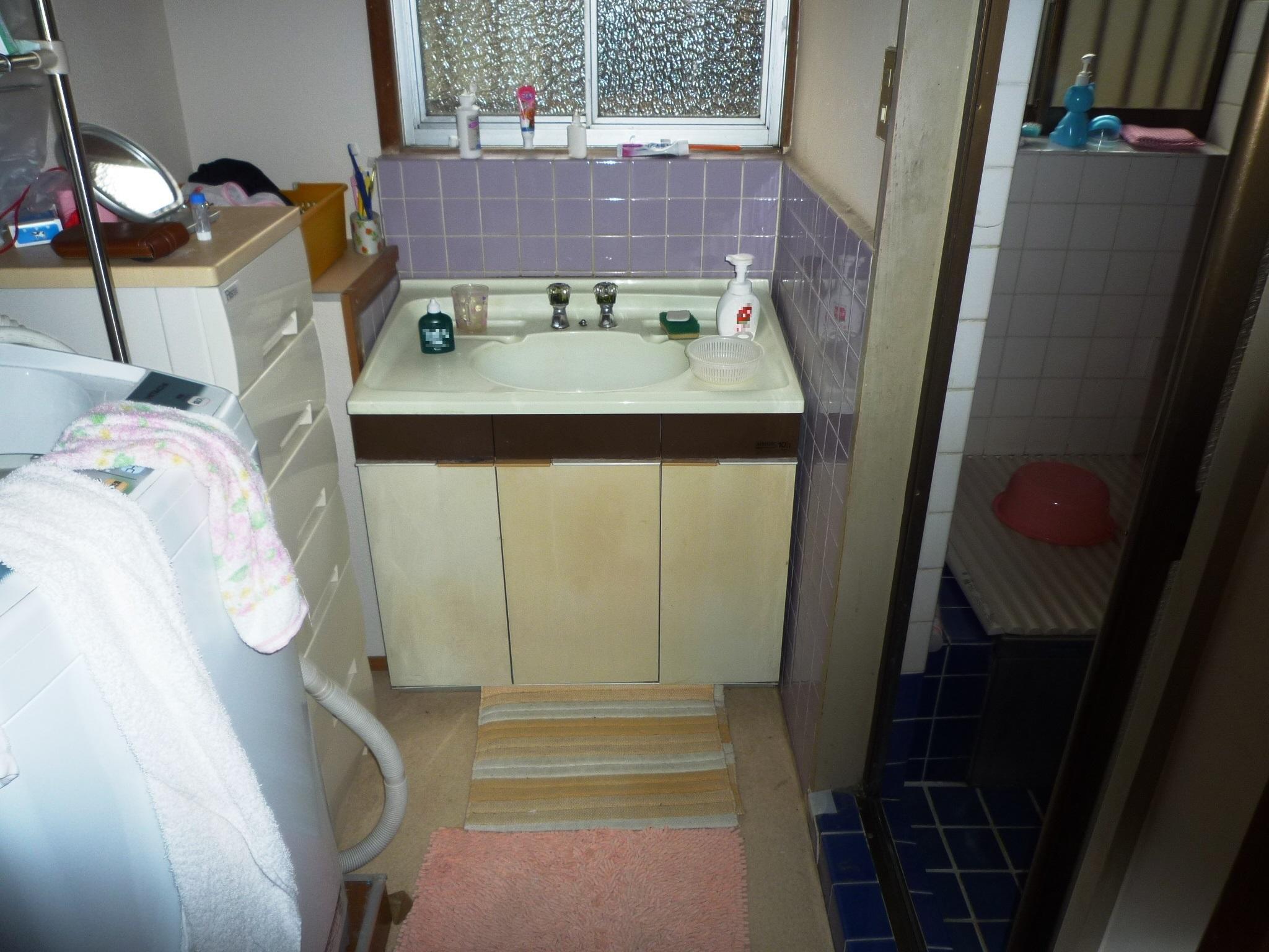 洗面化粧台の取替に伴い、洗面所全体の改装工事を行いました。壁タイルを撤去し、掃除のしやすいクロス貼りにしました。また窓の位置を変え、化粧鏡を取付できるようにしました。洗面所自体を広げることにより、脱衣スペースが広がりました。使い勝手が良くなったと思います。