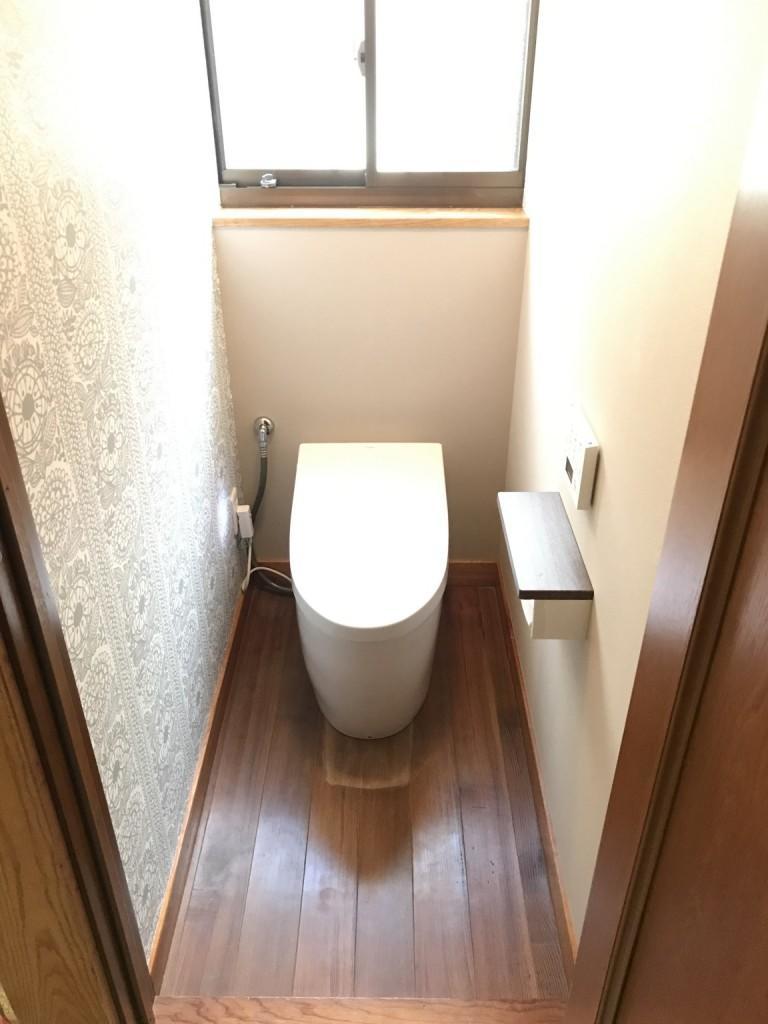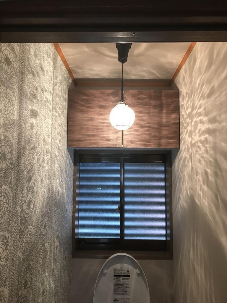 窓の上に収納ボックスを設置し、照明はオシャレなものに変更しました。