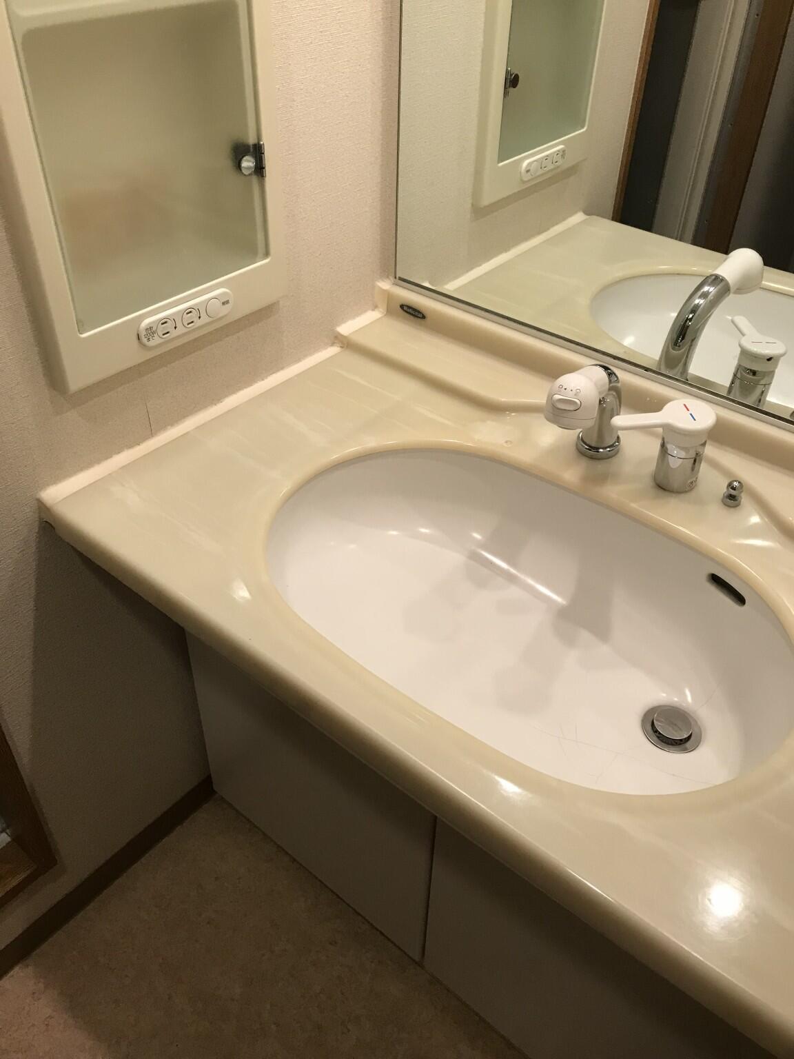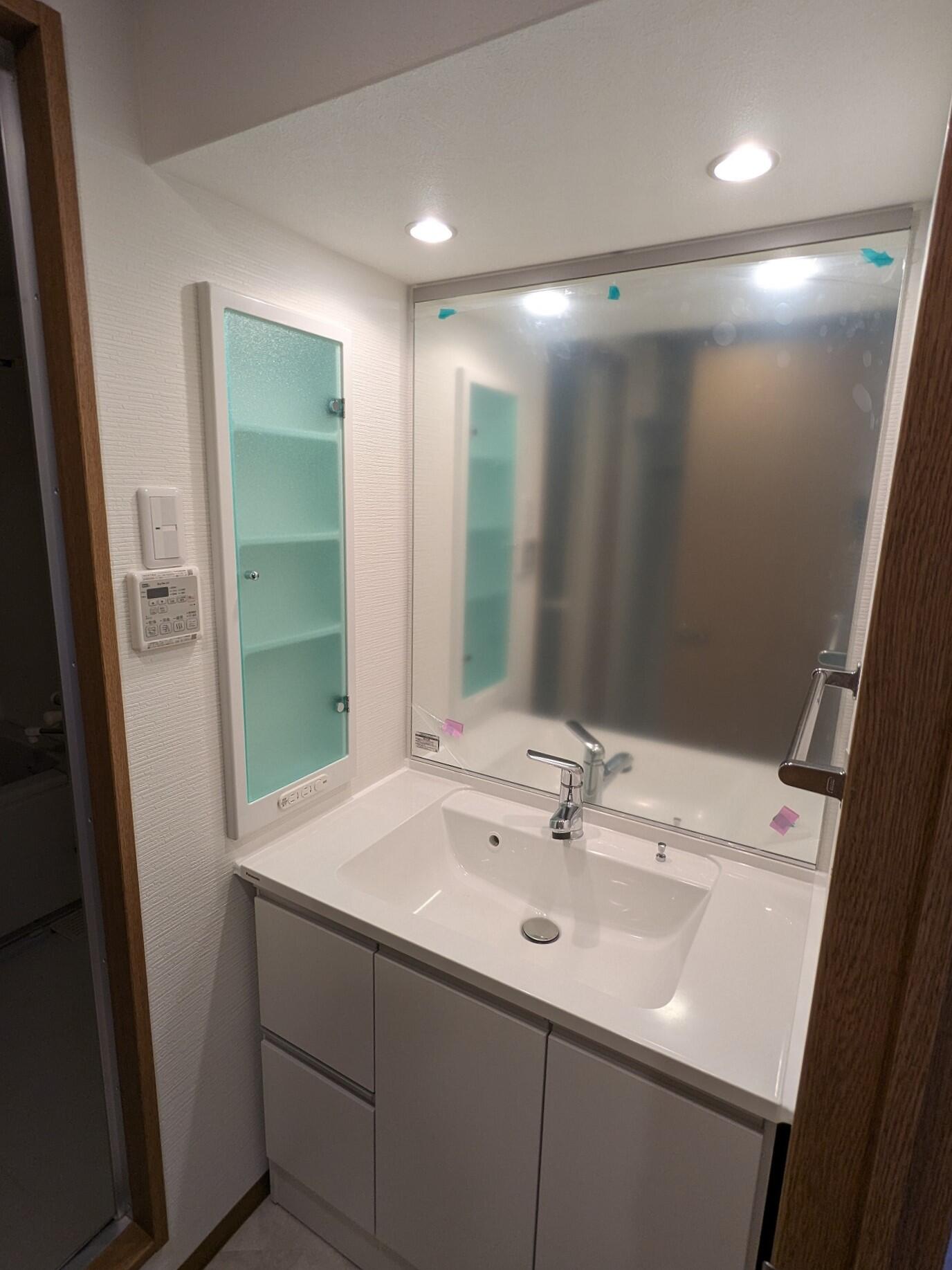 この度、洗面化粧台の取替えリフォームをさせていただきました。 収納扉下にスペースがあるので、マンションでも配管の移設ができます。