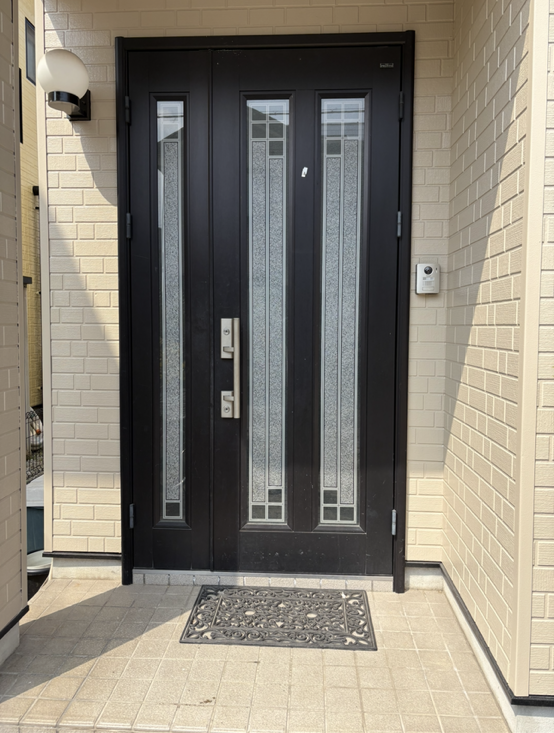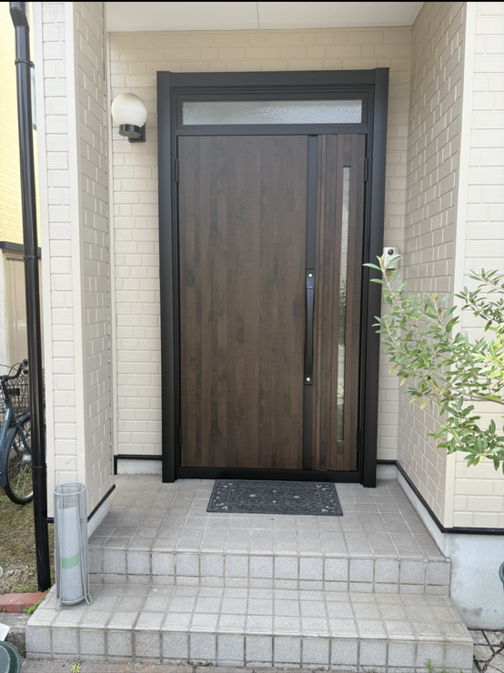 この度、玄関ドア取替工事を行いました。 弊社にお問い合わせ頂きましたきっかけですが、ドアキーが正常に作動せず、鍵がかかりにくい状態になってしまっていたとの事でした。 修理対応も可能でしたが、年数も経っていたのでお客様の方より、ドア交換にされました。 今回は、リクシル製「リシェント」を使用させていただきました。 リシェントは、カバー工法で施工できる商品で、既存の玄関枠を再利用しその上から新しく枠を覆うように作成し、玄関ドアを取り付けます。 インターホンが見えずらかったとの事で、今回は開き方向も共に変更させていただきました。 シンプルな見た目で、とても喜ばれました!