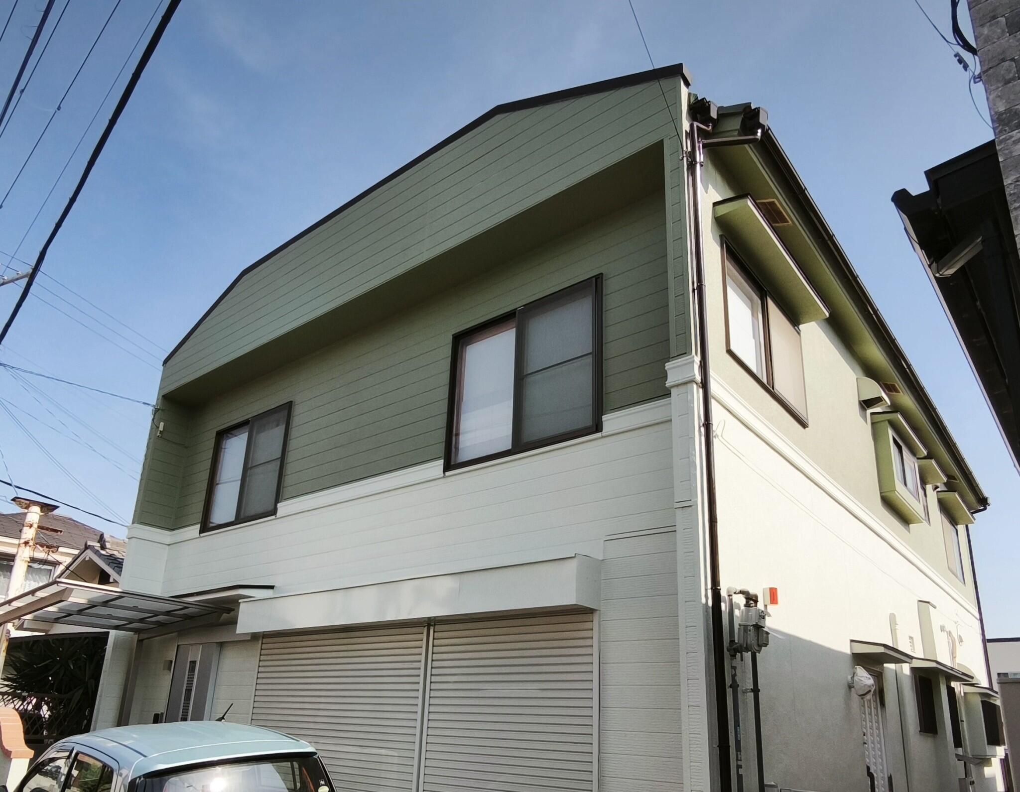 この度、外壁塗装のリフォームをさせていただきました。 帯(幕板)を取付け、上下塗分けしました。 上段は施主様が好きなグリーン系です。