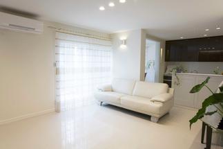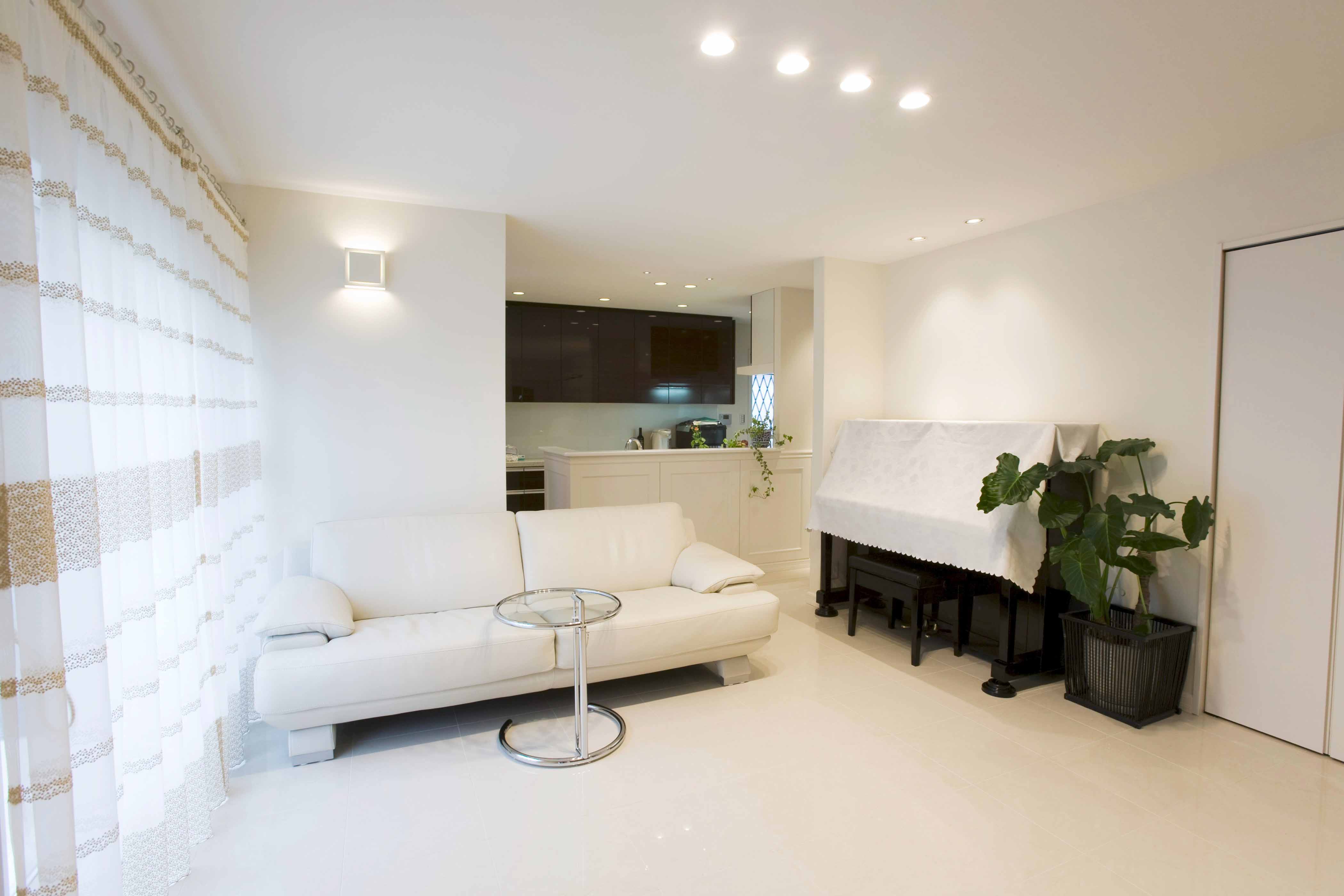 リフォームで実現した約25畳の広々としたLDK。キッチンはリビングが眺められる位置に配置し、圧迫感がでないように吊り戸棚は設けませんでした。