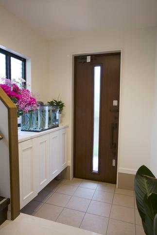 玄関ドアは断熱性能の高い製品を採用し、Kさんもこれで玄関まわりの冬場の冷えが解消されたと喜ばれました。