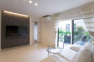 和室を1.5畳分狭くして、そのぶんリビングを広くしました。エコカラットの壁と壁掛けテレビ、LEDの間接照明でインテリアもスッキリしました。