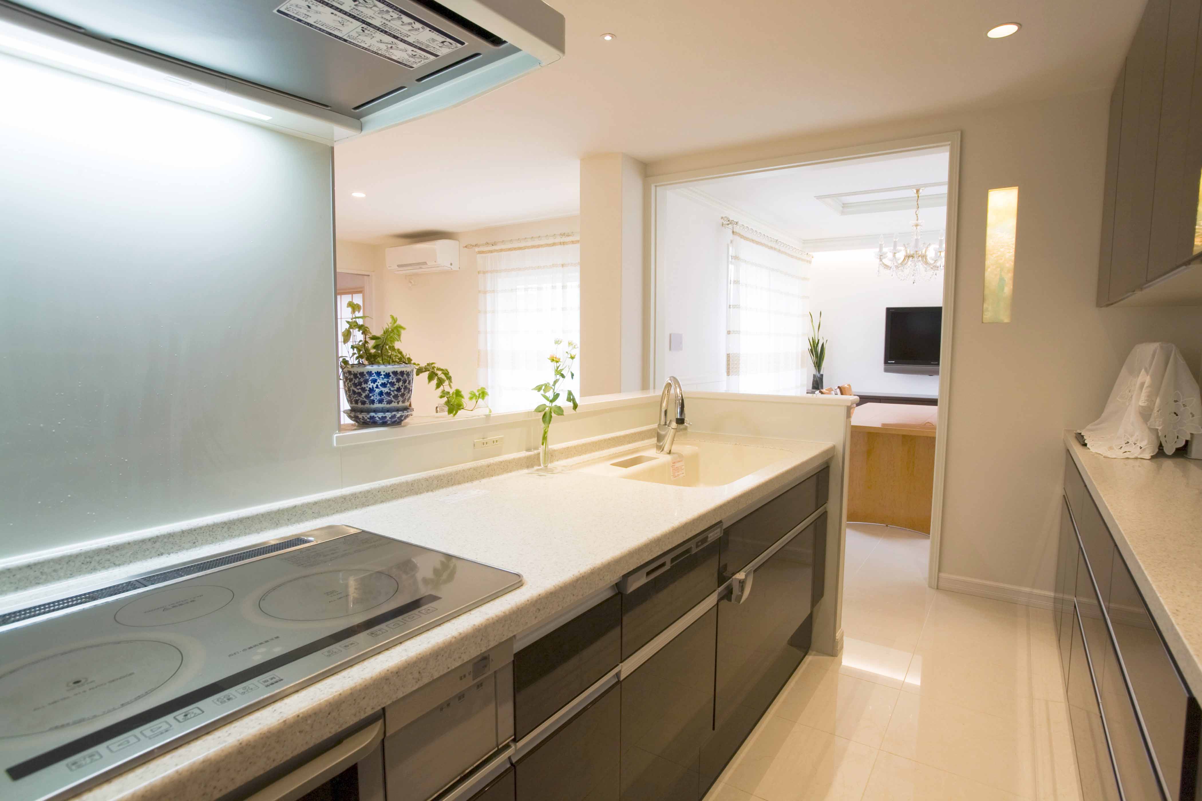 家族との団らんやおもてなしも楽しいオープンキッチンはリビングとのインテリアの調和を考慮し、家具調の腰板を特注しました。