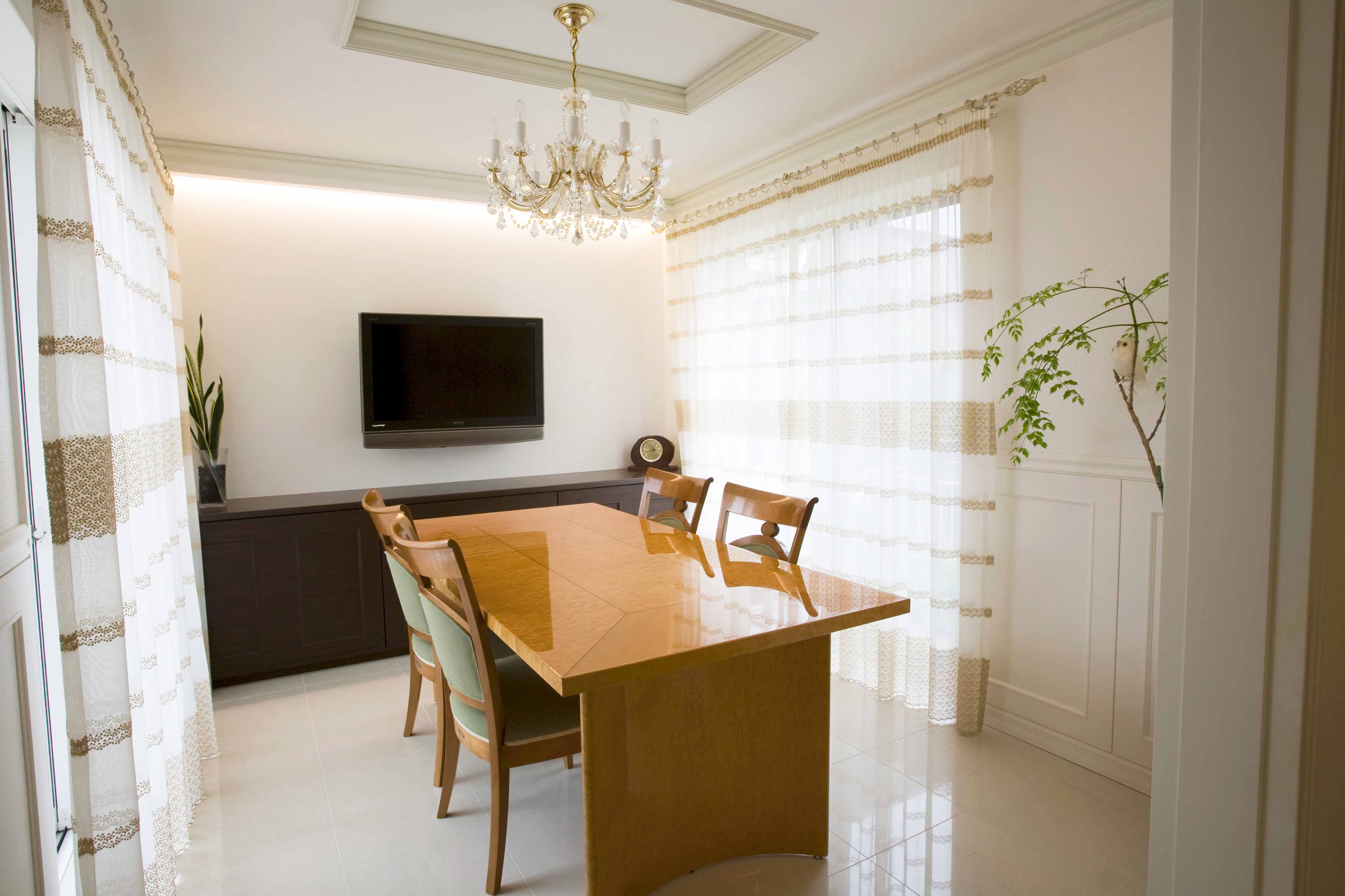 増設したダイニングスペース。大理石調タイル床、モールディング(天井の縁取り)や折り上げ天井でエレガントな空間に。