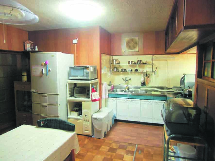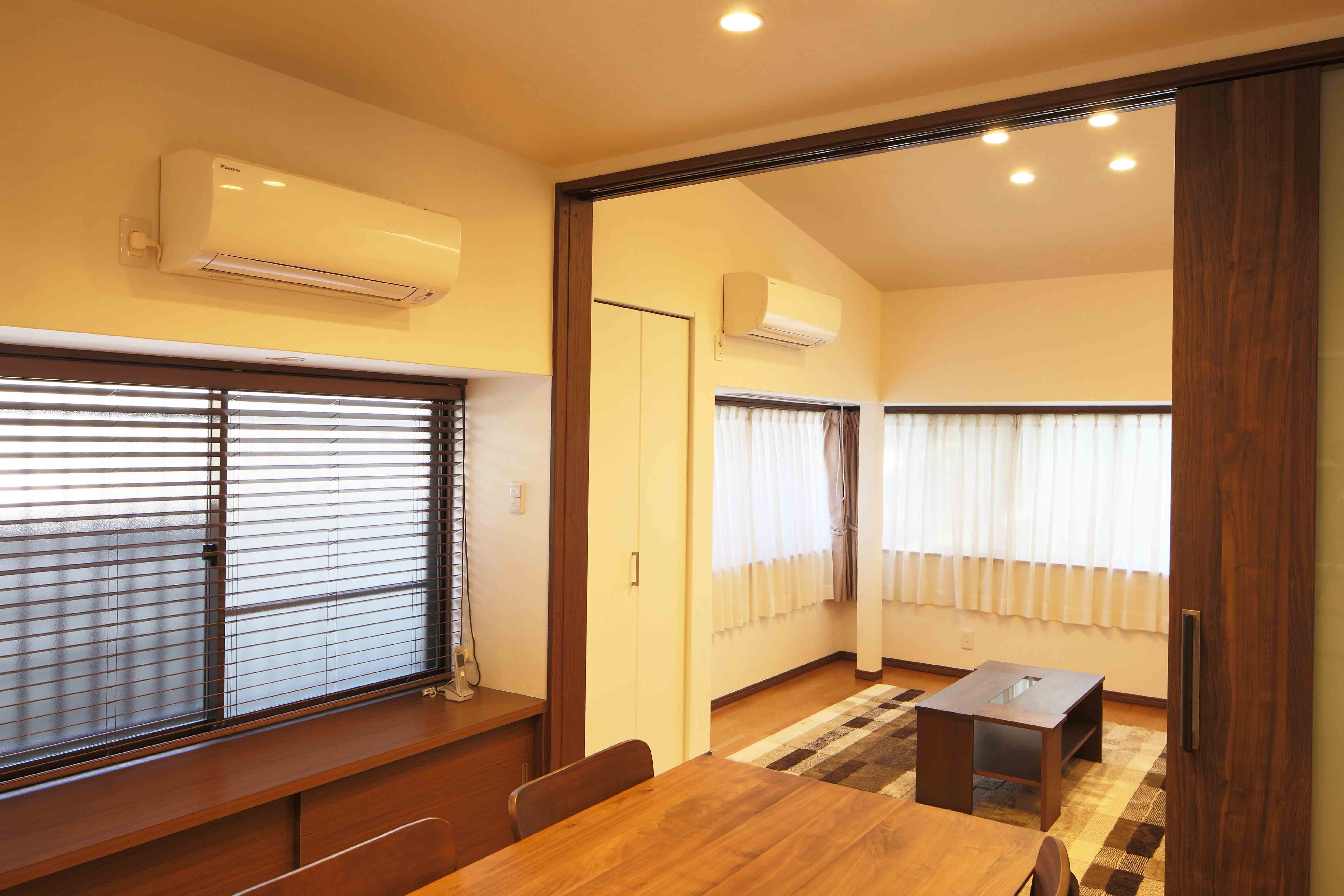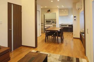 ダイニングキッチンとリビングの間仕切りの開口を拡張子、フロア段差をなくすことにより、広々としたLDKへ。