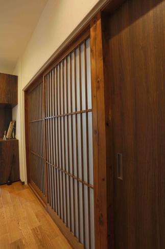 奥さまがデザイン・色にこだわってオーダーメイドされた障子と引戸。既存の柱とも色があって和モダンな雰囲気になりました。