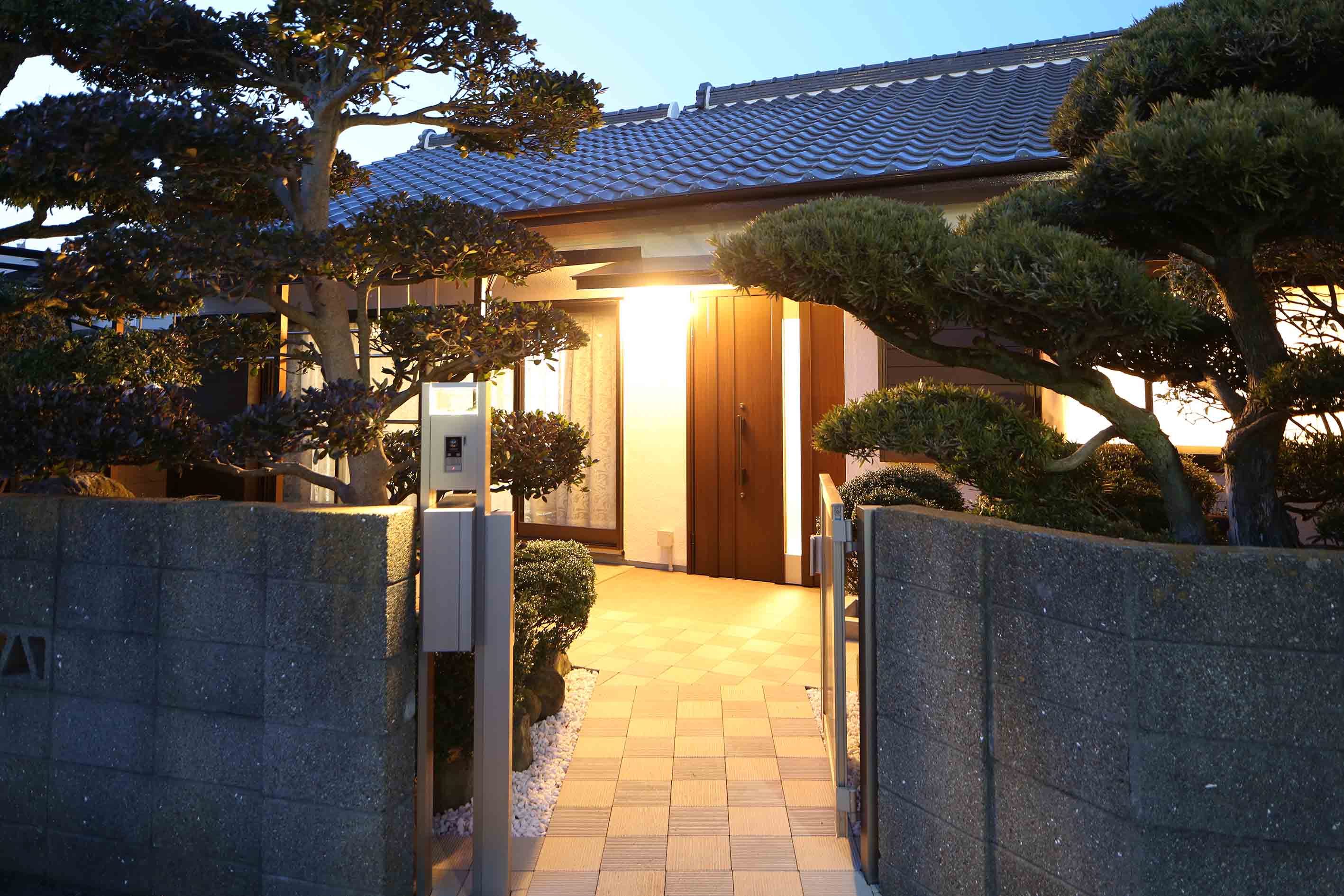 和風の外観にあわせて、スロープをデザイン。排水路へ白玉砂利をしきつめる事によって、和の風合いを出しました。