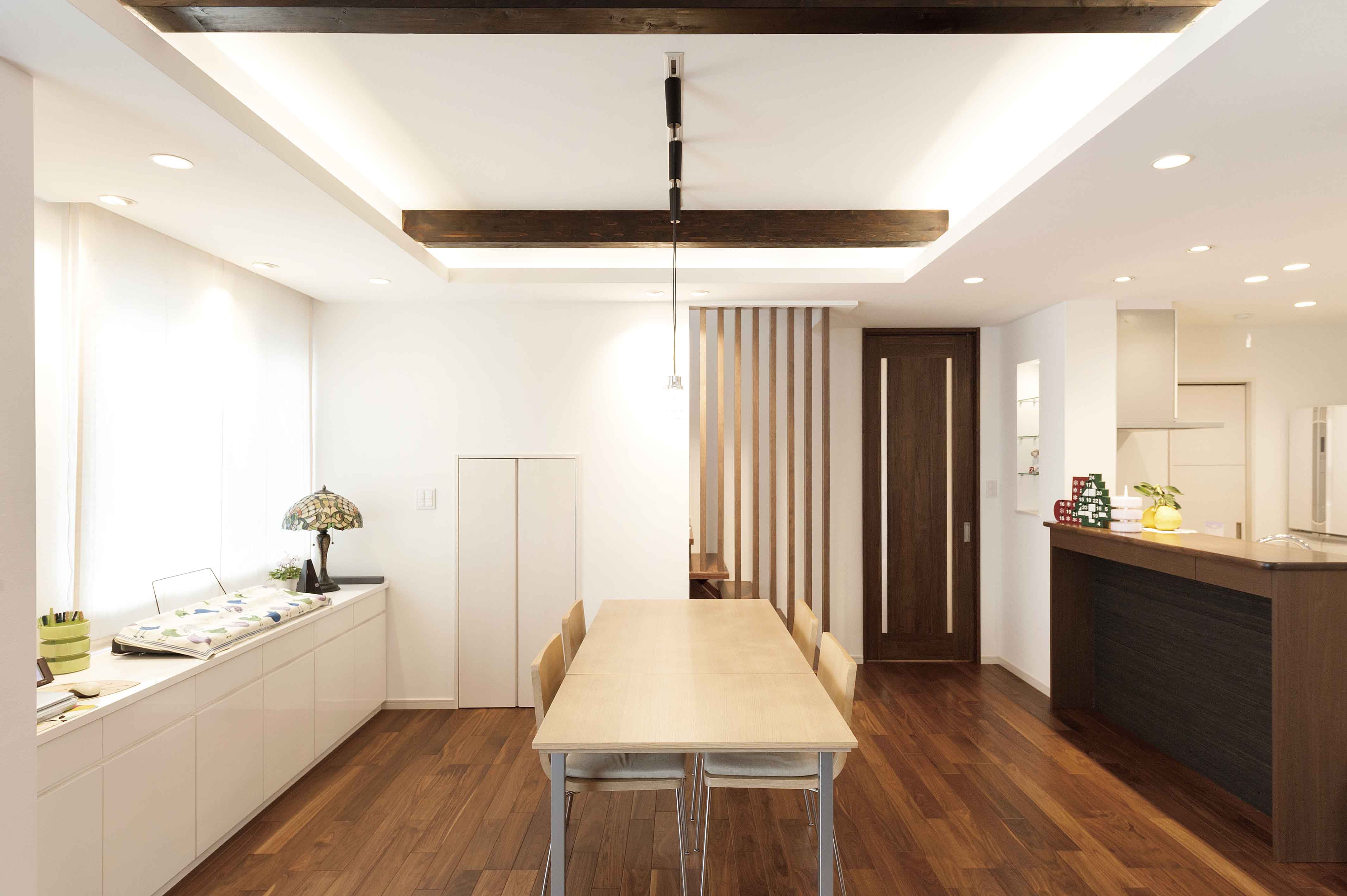 ダイニングの天井は、折り上げ天井をわたる梁を間接照明がライトアップ。光源が見えず、それでいて光が広がるように計算し、絶妙な寸法で配置されています。