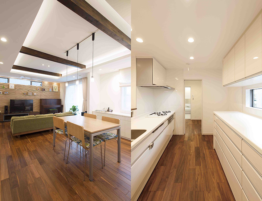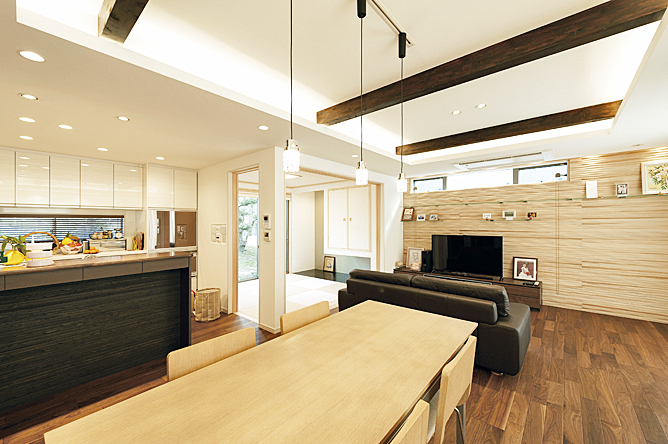 LDKと和室が一続きで、ぐるぐる回遊できる間取り。TVボードの背面には木の建材を用いており、ペンダントライトに照らされると、手掘りの陰影がより一層美しく浮かびあがります。