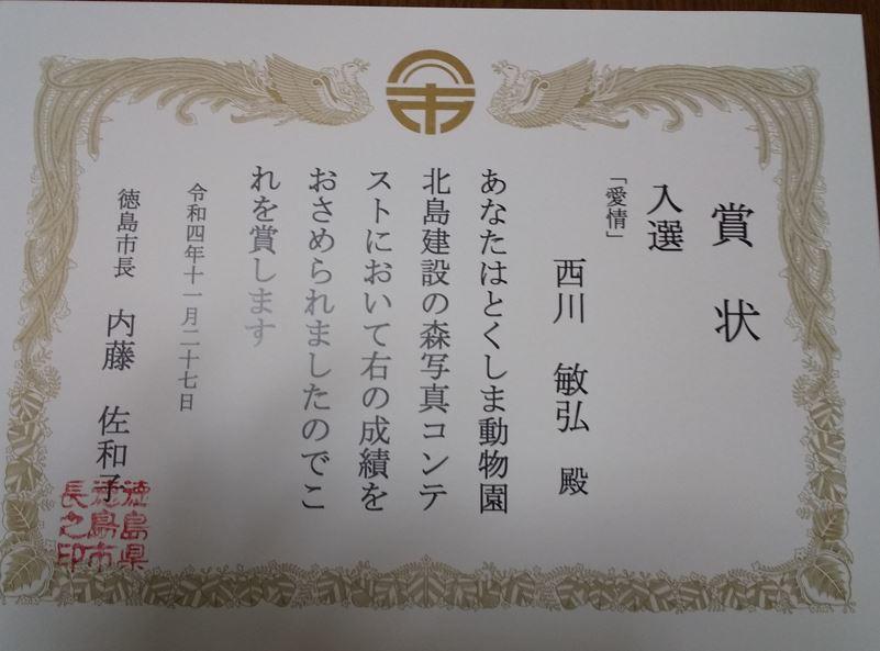 とくしま動物園北島建設の森 写真コンテストに応募されて、