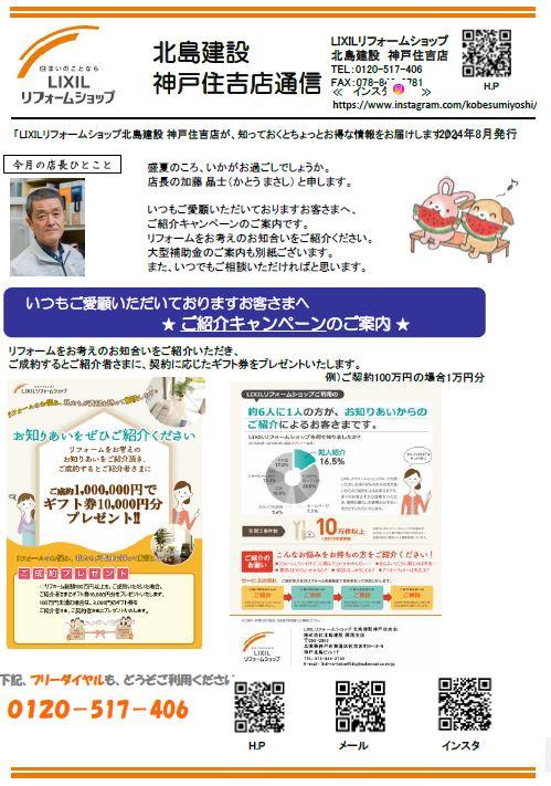 『LIXILリフォームショップ北島建設 神戸住吉店 2024.8通信』を