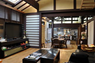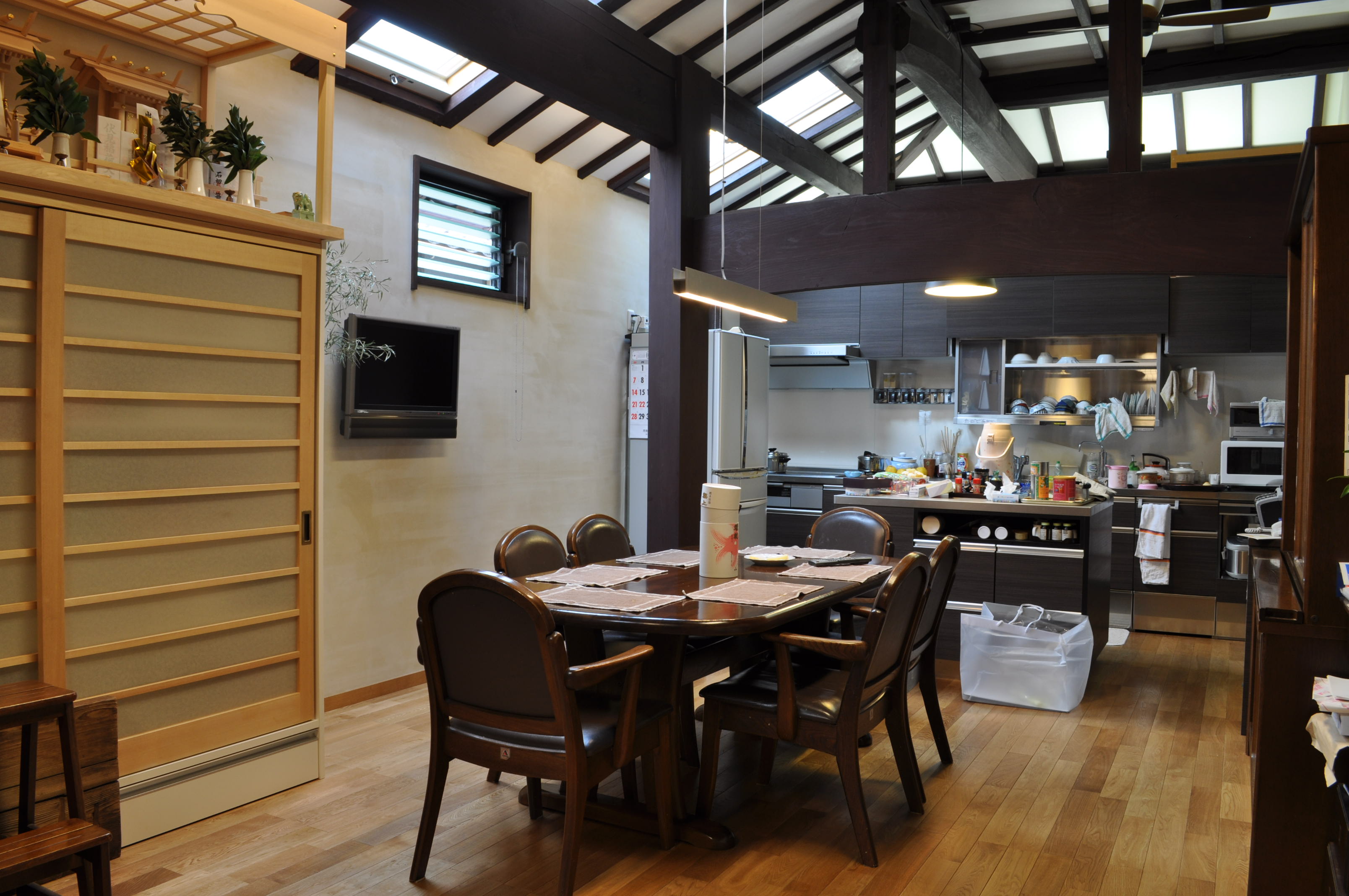 以前のリフォームで床上げ、天井貼が施してあったが、天井を撤去し梁、垂木を化粧材として露出させた。