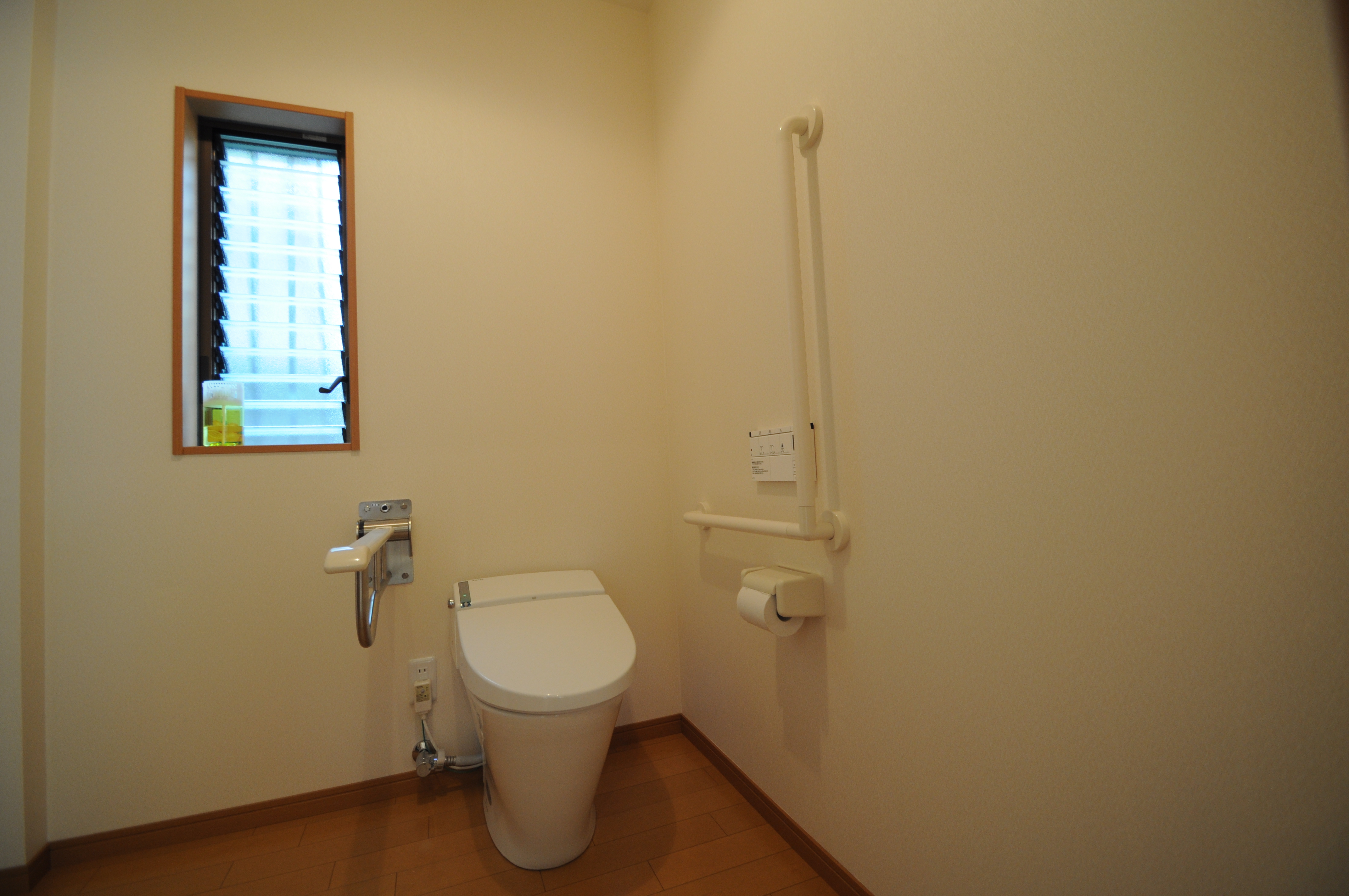 【トイレ】 設置スペースのコンパクト性、デザイン性よりサティスを選択。 手摺、紙巻器等の位置は奥様入院中の病院と同じとした。