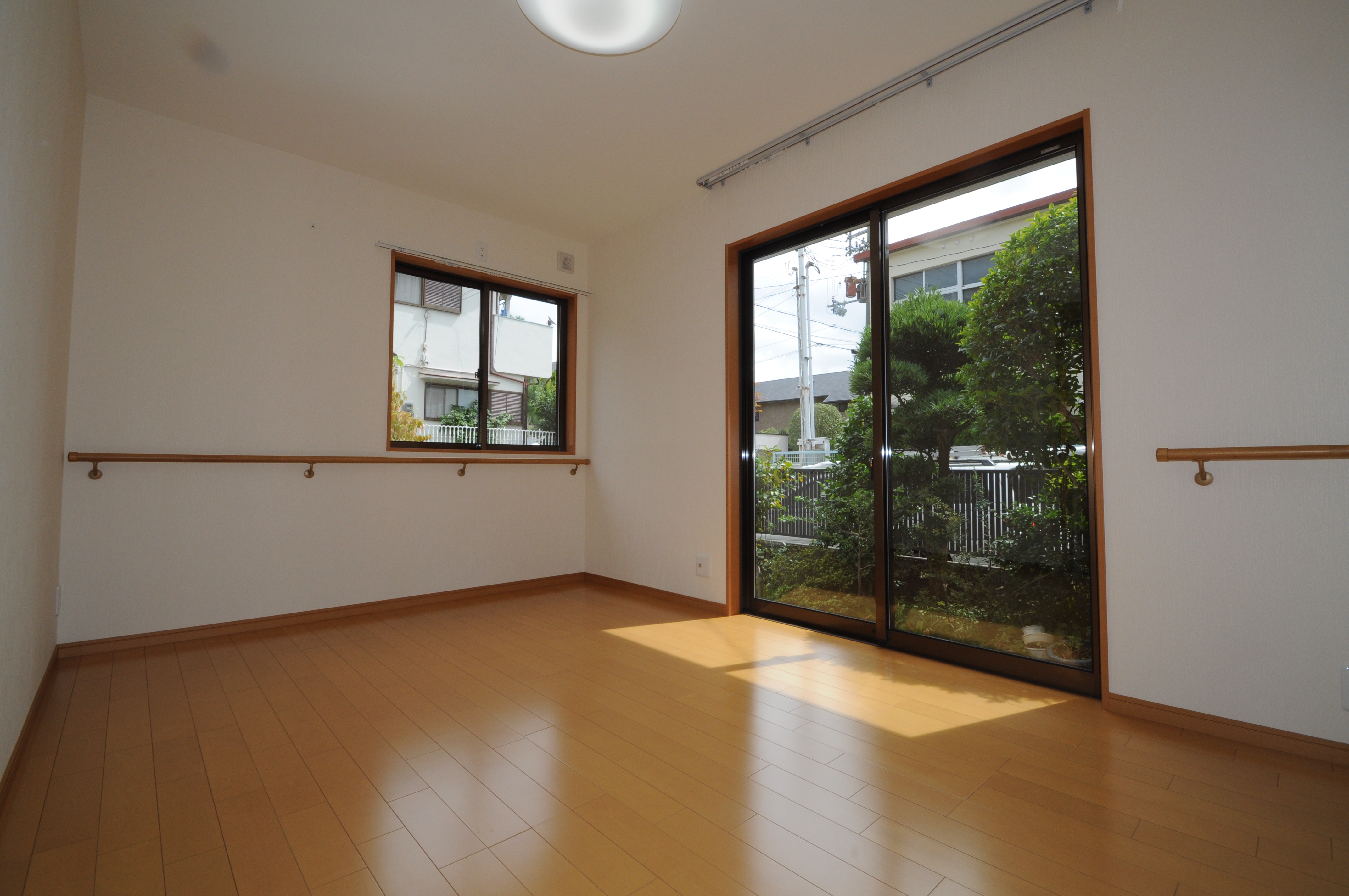 【奥様の寝室】 車椅子というハンデにめげずアクティブな生活をしていただきたくて一番明るい南東角の位置をを奥様の寝室とした。 お手持ち家具の配置をした上で手摺を設置した。