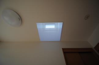 【ダイニング天井】 電動式トップライトにより採光、通風を補助。 天井面の開口は900*900、15角のルーバーにより光を和らげた。