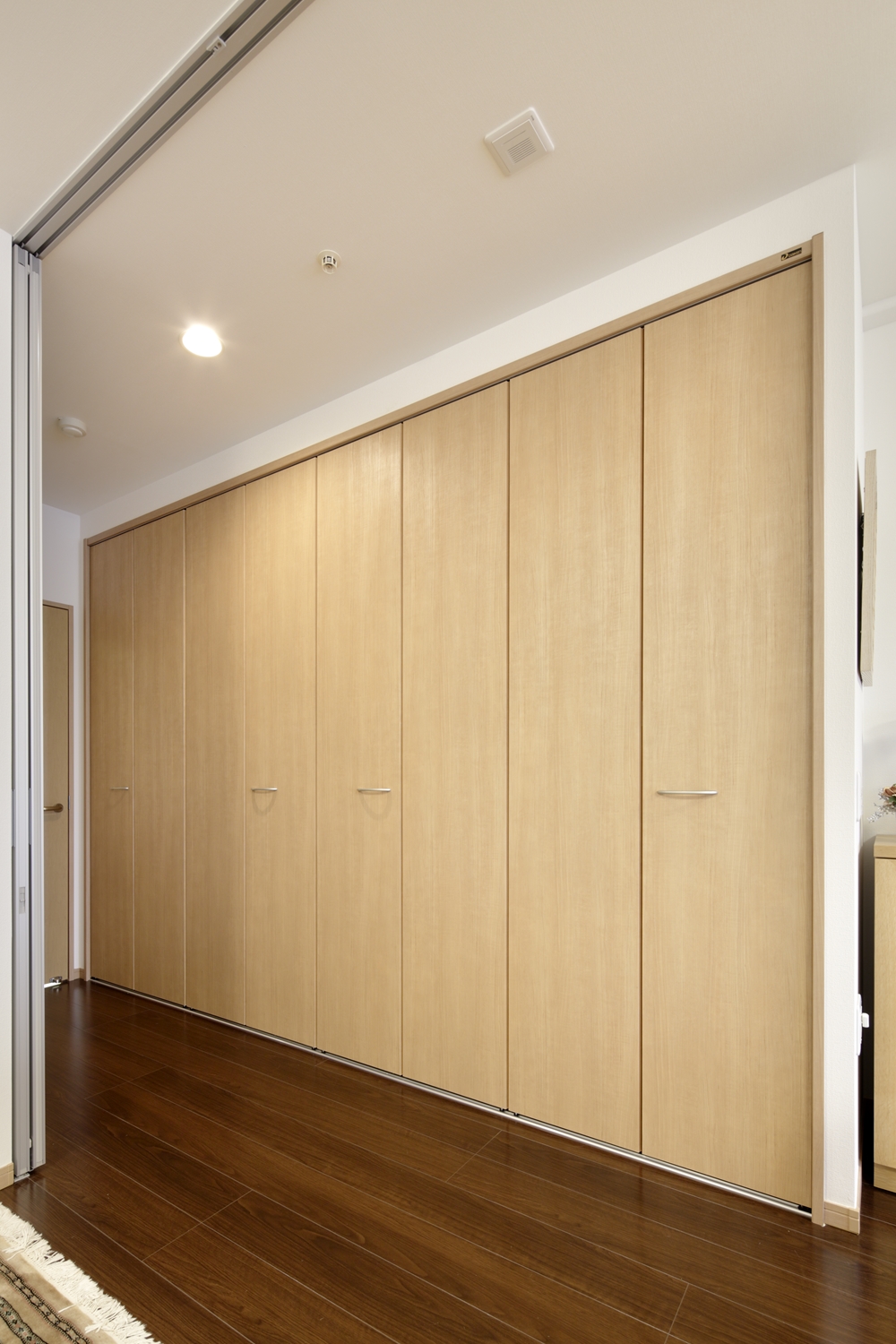 既存の住まいは玄関からリビングへ入るのに和室を通らなくてはならず大変不便であった。さらに収納も少なく洋服などが多い奥様には物足りない。和室を無くして玄関から直接入れる広いリビングと大容量のクローゼットをご提案。