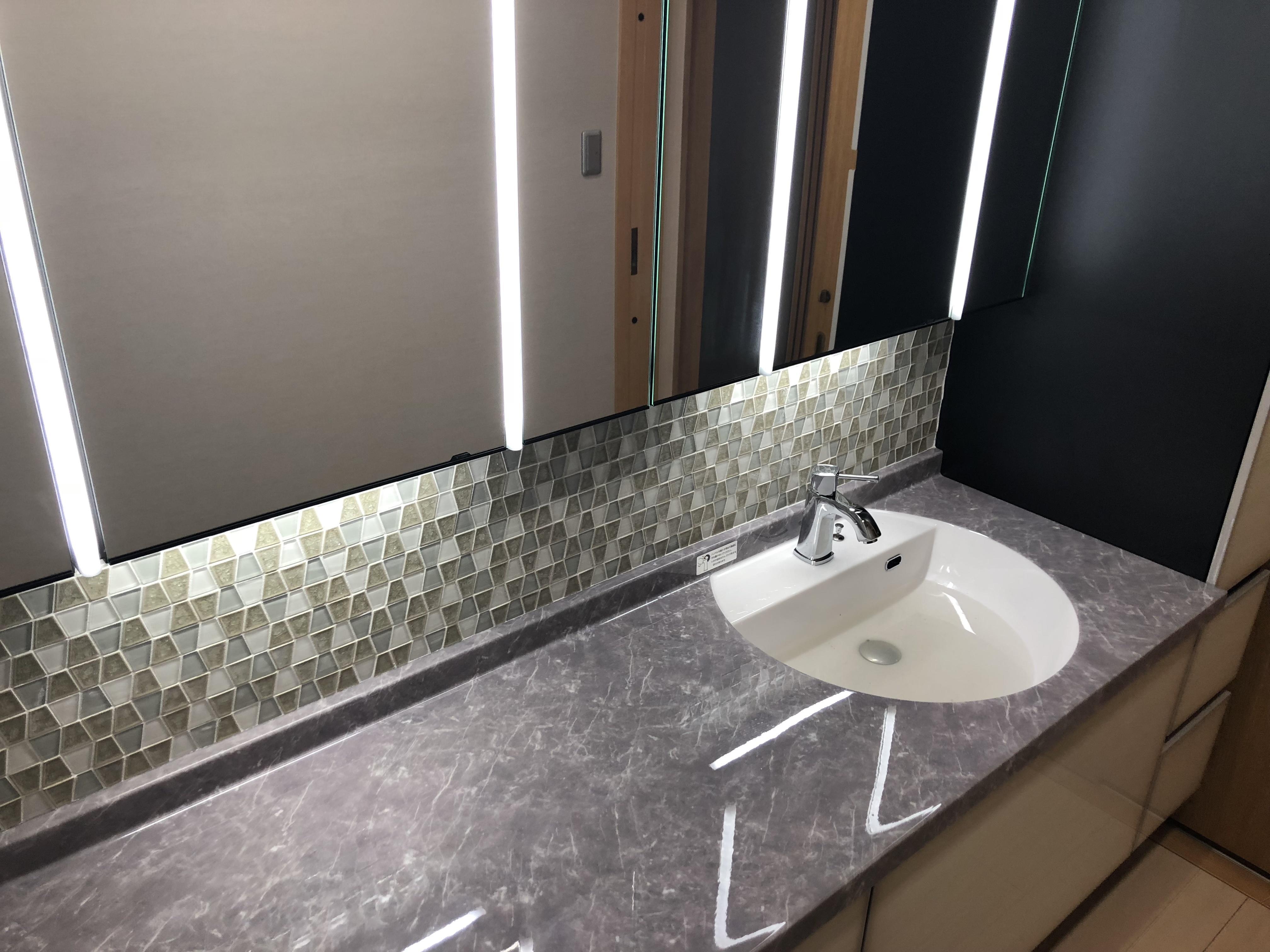 ラピシアカウンター 上質な大理石カウンターの風合い。フェイスフルライト 顔を左右から明るく照らし、影を作らない最新設計。