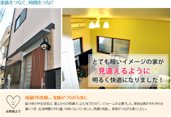 中古住宅を購入したものの雨漏りの不安が判明し他のリフォーム会社さんにも問い合わせてみましたが納得がいかず、地元の橋本建設様(ライファ神戸ひょうご)に丁寧に対応して頂け、安心してお任せする事が出来ました。内装に関してもじっくり希望を聞いて頂き、何度も打合せをして頂きました。とても暗いイメージの家が見違える様に明るく広々として快適な住まいとなり、とても嬉しく皆様に感謝しています。