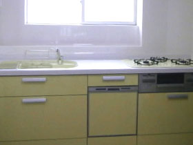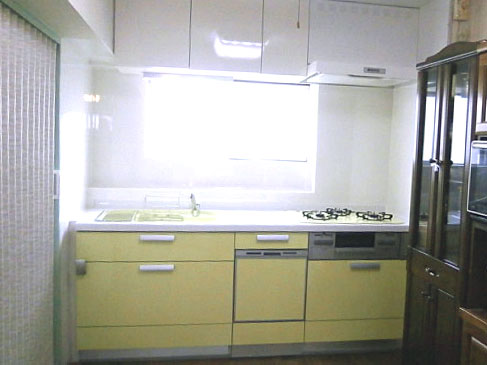 コンロ、シンク、扉のカラーをコーディネート。吊戸棚をホワイトにしたので圧迫感がなく、空間に広がりが生まれました。sunwave アミィ2100