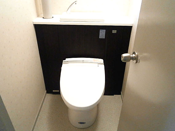 隅付ロータンクと配管で、奥のスペースの掃除がしにくかったトイレは収納キャビネットでタンクや配管ダクトがかくれ、お掃除がうんと楽になりました。見た目もすっきりし、収納量アップ、節水6リットルと良いことづくめに。INAX ピタ