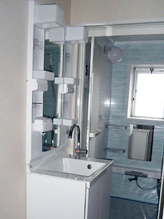 廊下の突き当たりを仕切っただけの狭い洗面スペースは浴室ドアの出入りも考えて、幅60cm奥行き44cmの薄型洗面化粧台に。 INAX エスタ500