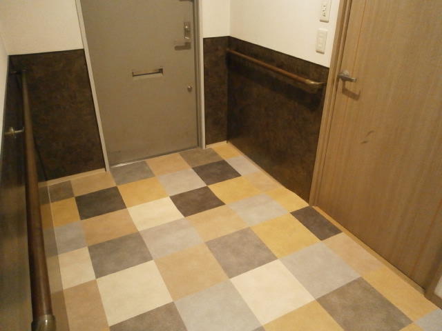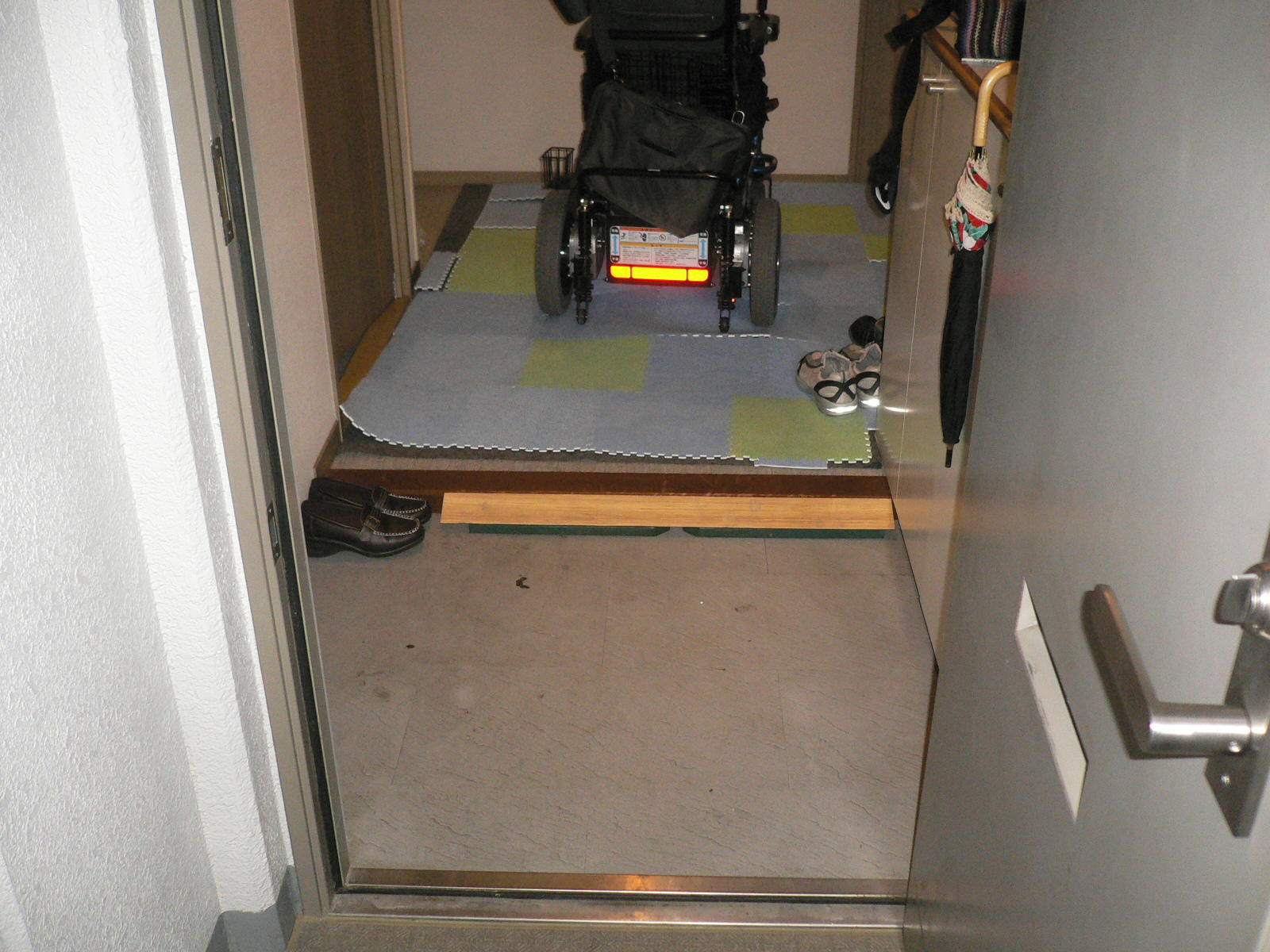 マンションの玄関の段差解消にスロープを設置しました。車いすが回転できるように床部分は丈夫な店舗用のタイルを張り、腰壁には丈夫なパネルを取り付けました。