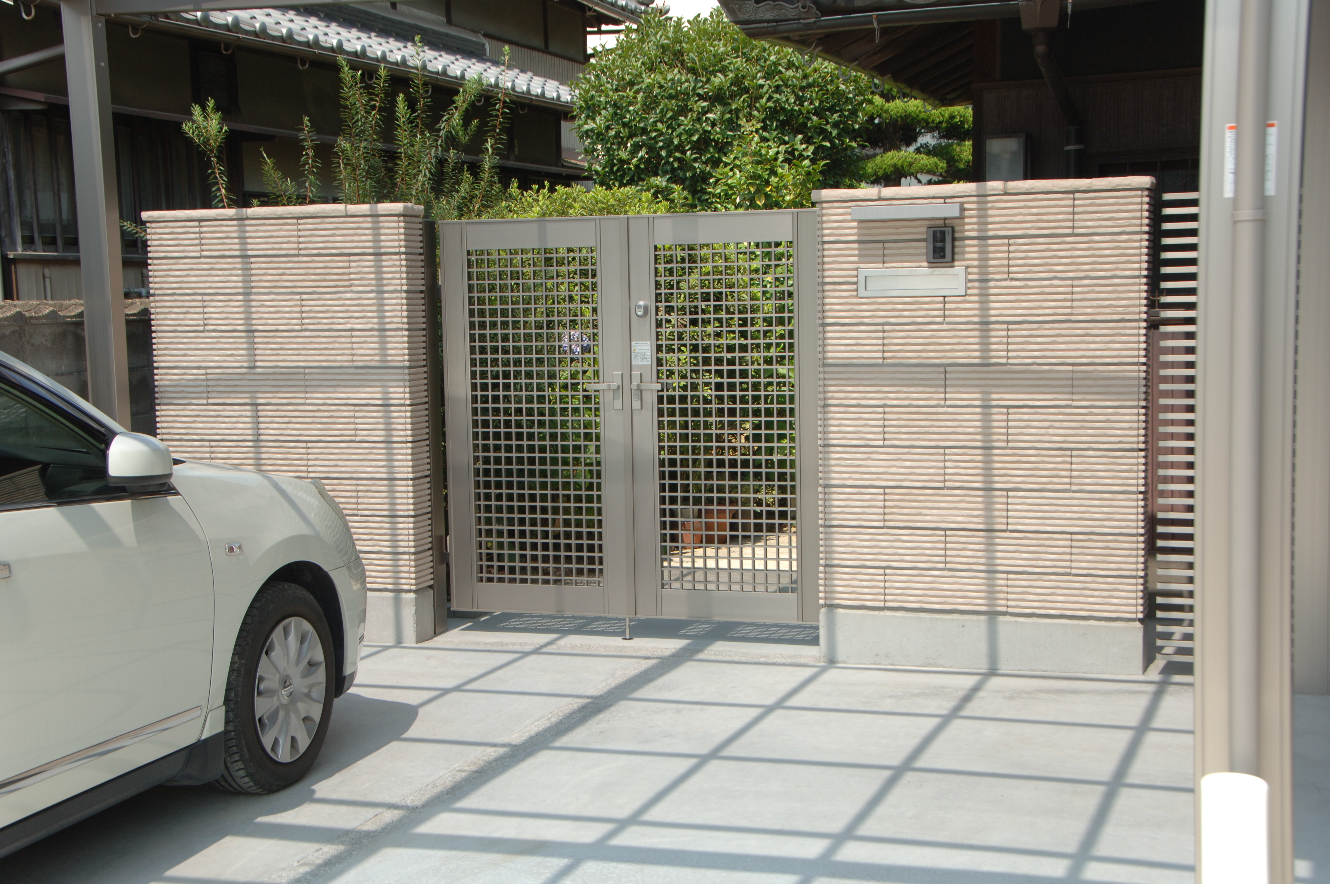 「車を2台駐車できるようにしたい」そんなご依頼から、商談はスタートしました。 思いきって門扉を玄関近くに変更することで、とても開放的で使い勝手の良いエクステリアが完成しました。 雨の日も濡れることなく車まで行くことが出来ます。 小さめの車なら4台でも停めれそうな感じですね。これで御心配されてました親戚がたくさん集まった時も安心です。
