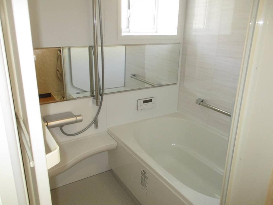 在来工法のお風呂をユニットバスに改修です。ワンちゃんと一緒に入りやすくしたいとの要望もあり、丸洗いカウンターをお選び頂きました。洗い場のカウンターが簡単に外せて、広くなり、お掃除もしやすいデザイン、構造になっています。横長のデザインの鏡など出来上がりに大変喜んで頂きました。また、洗面室、廊下、リビングのクロスの張り替えもご依頼頂き、家が綺麗になったと笑顔を見せてくださりました。