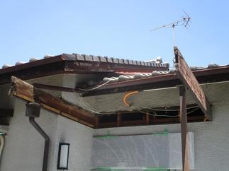 玄関庇の雨水排水の機能が悪く、水がまわり天井材が劣化して垂れさがっていました。剥離の危険性があったため、既存の庇を撤去して新設することになりました。幕板に包まれた庇屋根形状と内殻に設けられた内樋により雨水排水をする方法だった為、内樋の詰まりによる漏水が起きたと考えられます。新設する庇は、軒先に外付の樋を配し、庇の形状もシンプルに収めることにして、庇本来の機能のみに重点を置いて設置する事にしました。
