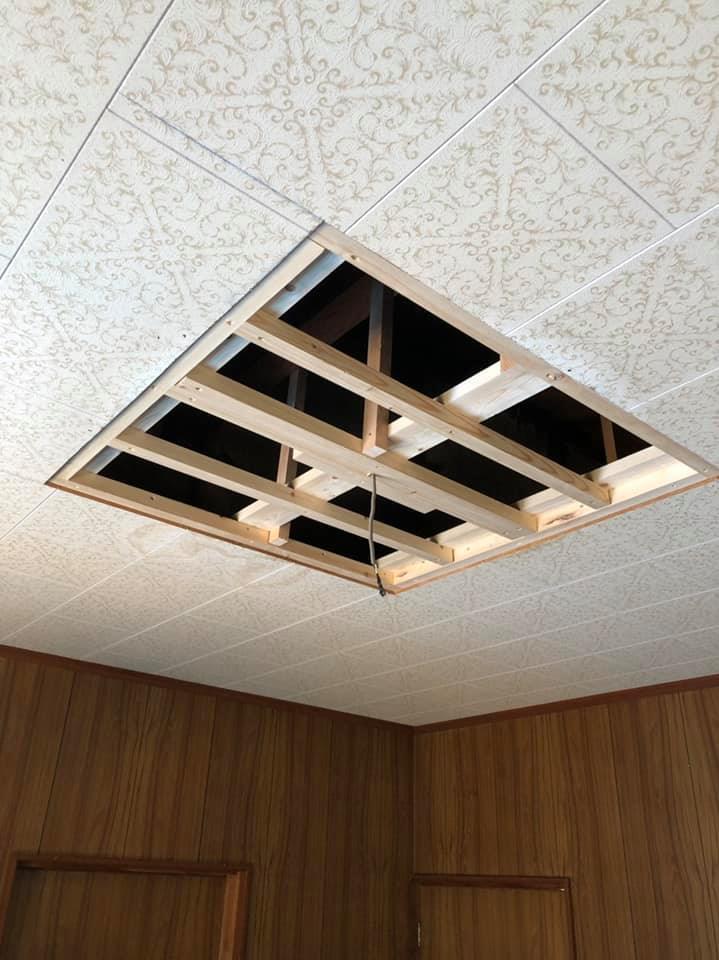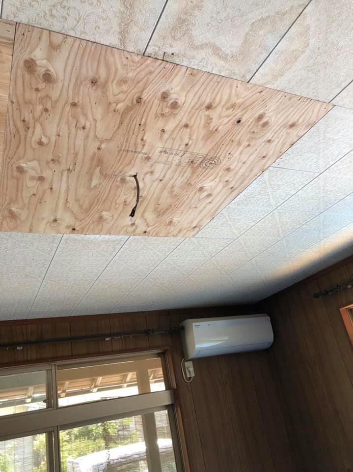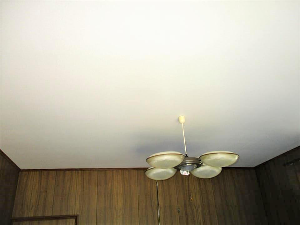 今回、居間の折り上げ天井をフラットにしてクロス仕上げにしたいとのお話がありました。折り上げ天井は空間を広く見せたりゴージャスに見える効果があるのですが、照明をしっかり考えないと光が部屋全体に広がりにくいのが特徴です。ご主人様より、天井の下地施工時に照明器具の取付箇所を補強しておいてもらいたいとの事で、既存の折り上げ天井撤去補修部を吊り木も併せてコンパネ下地張りとして、クロス下地ベニヤの上貼りを行いました。
