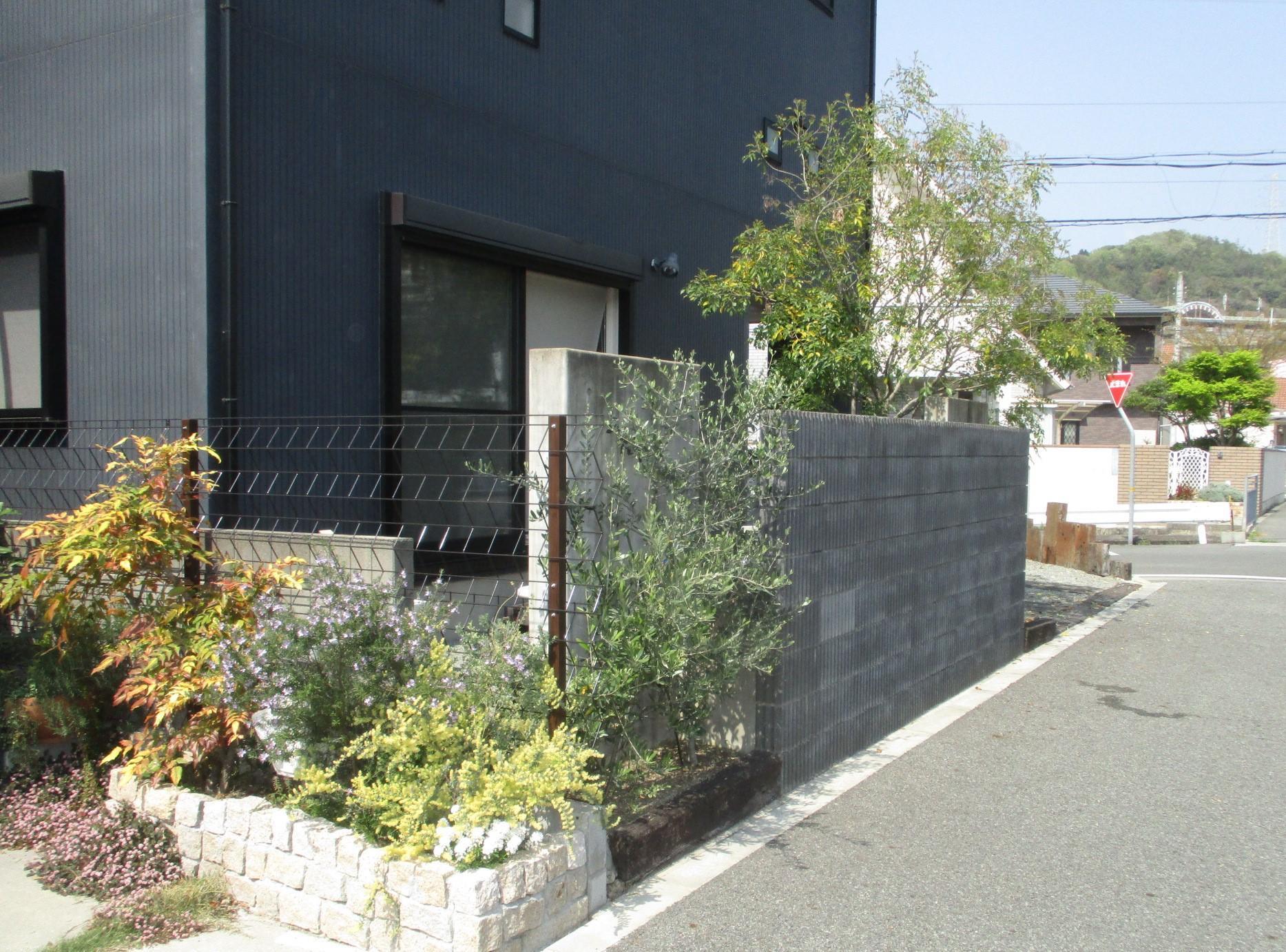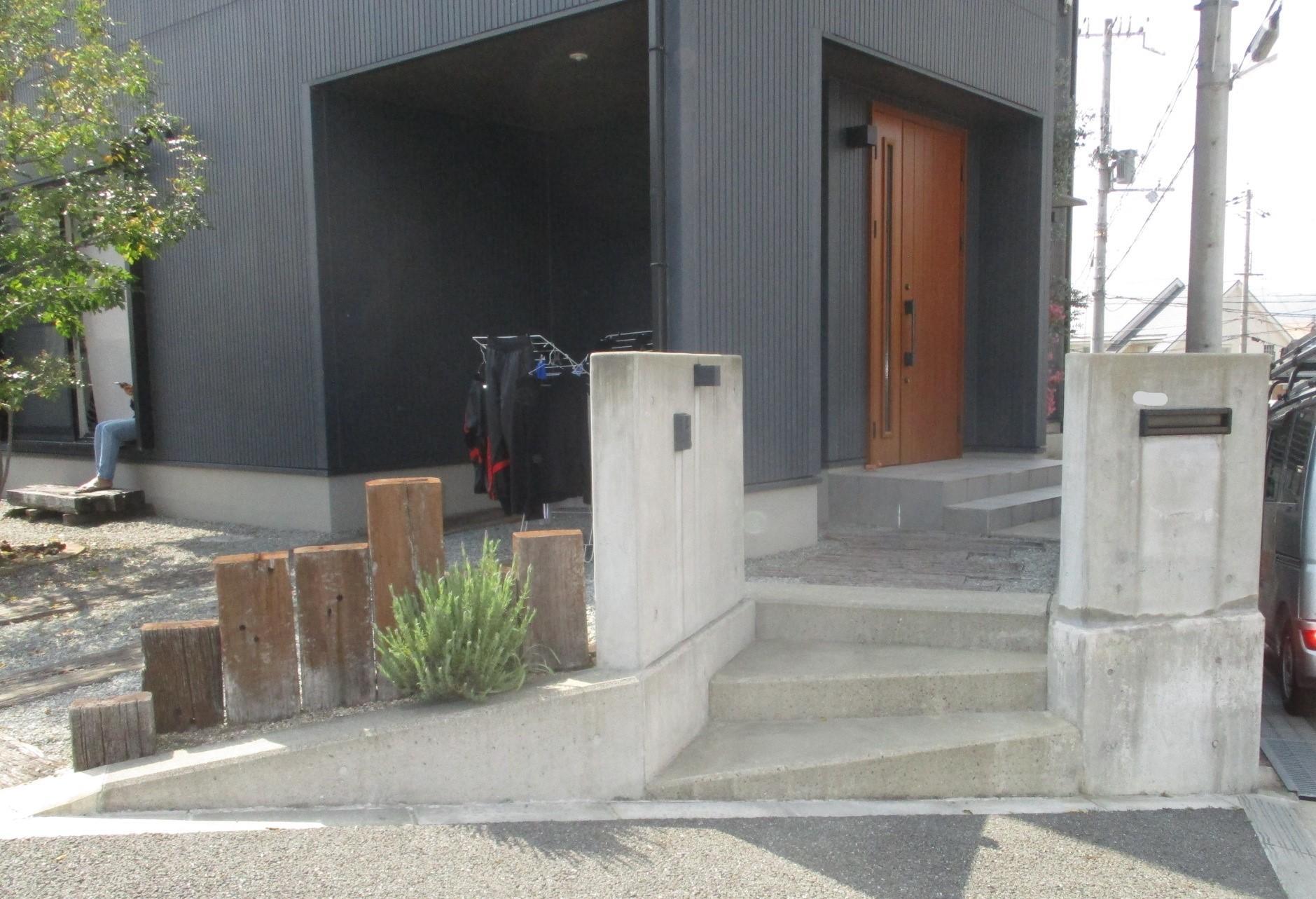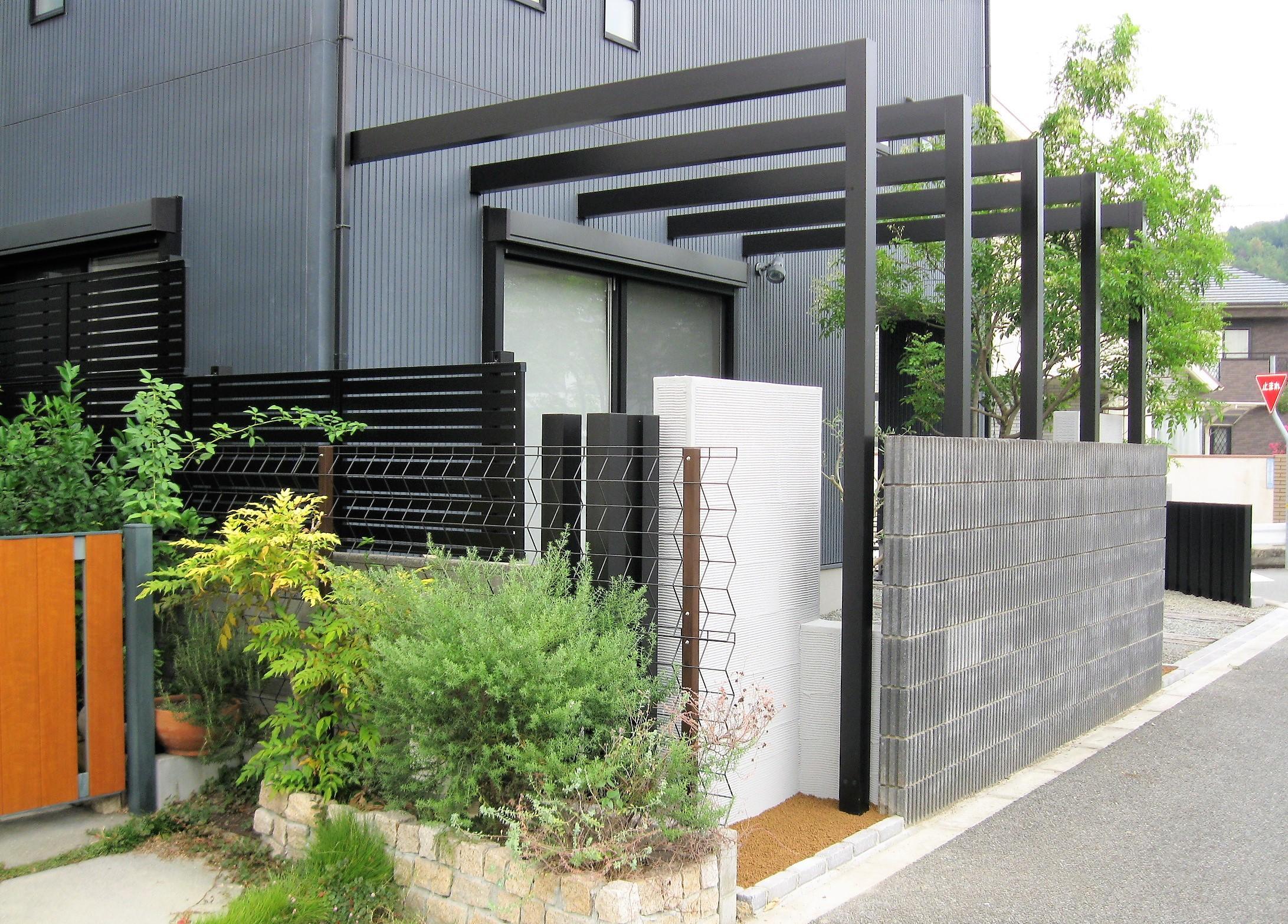建屋と塀との間がオープンすぎて物足らないとの事でフレームを設置して空間アクセントを設けました。また、既存設置してあった枕木材も腐食が進み取り替えたいとの事でアルミ製の枕木材を設置、経年の汚れが目立ち始めたコンクリート打放し風の塀も下地を整えて化粧材塗りを行い、屋内側からの隣家との目線を防ぐ為に目隠し風のフェンスを少し高目で設置しました。