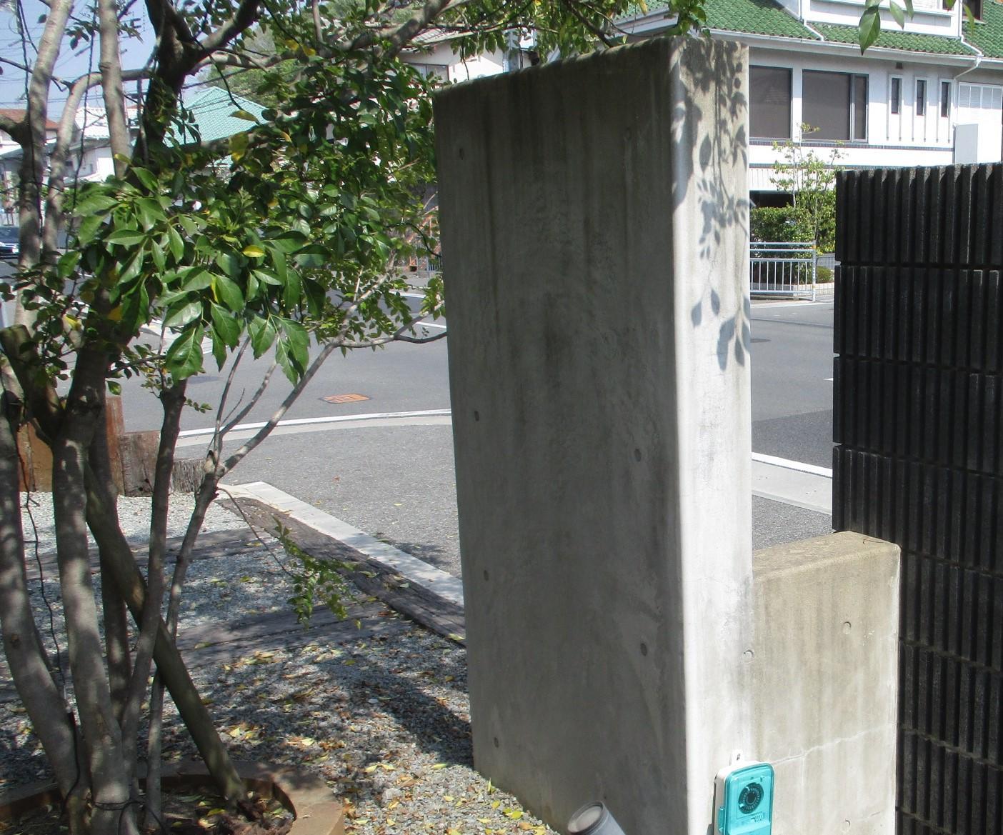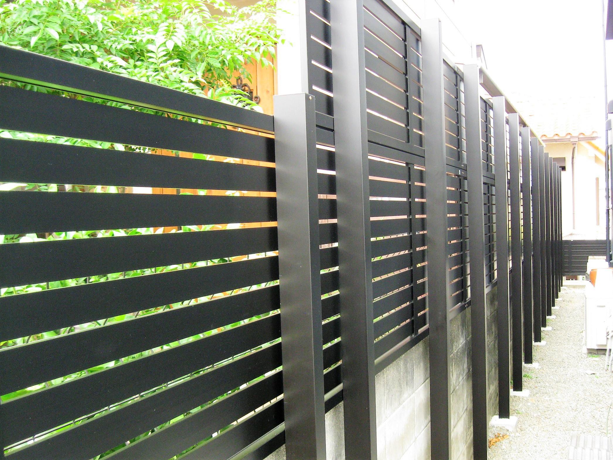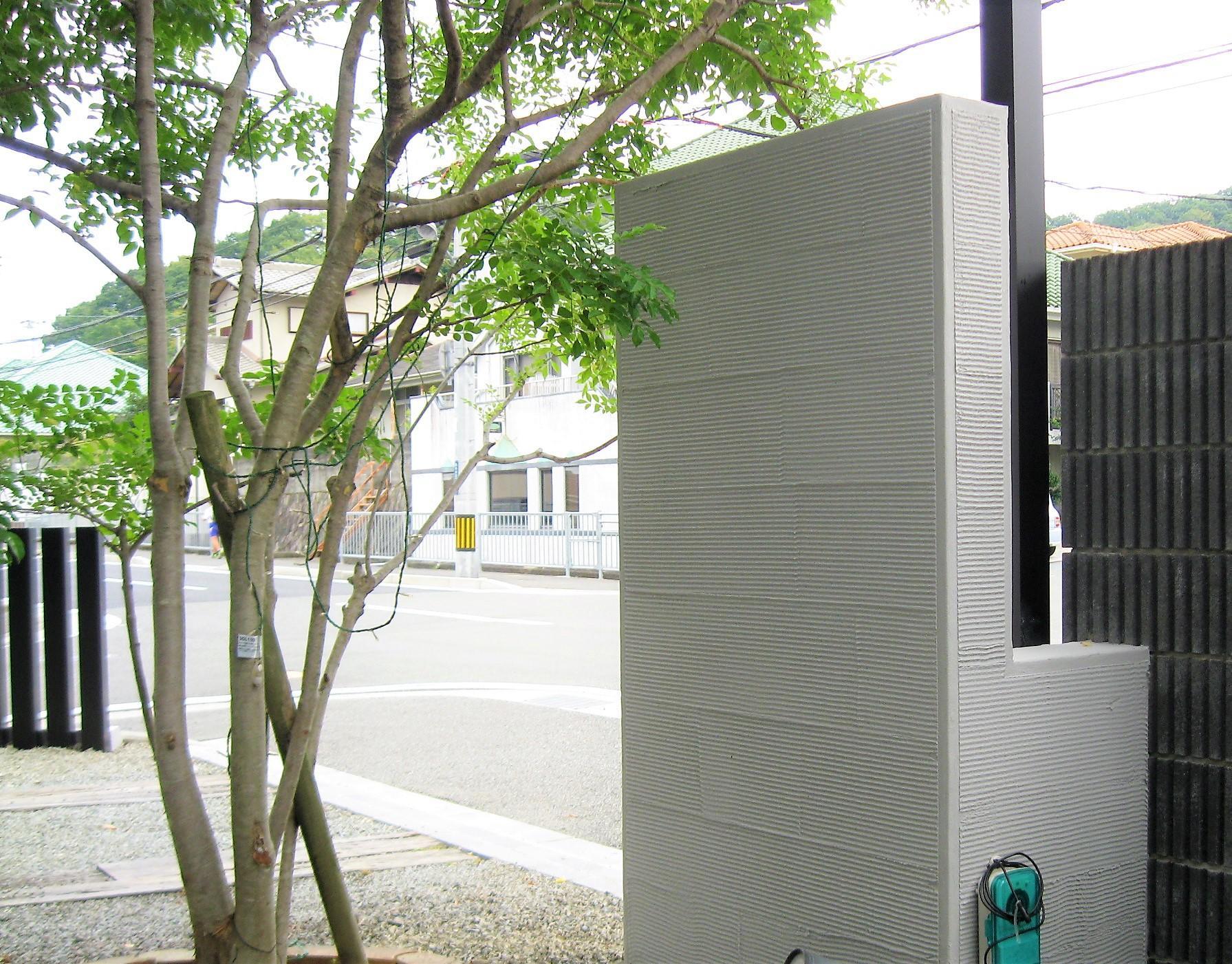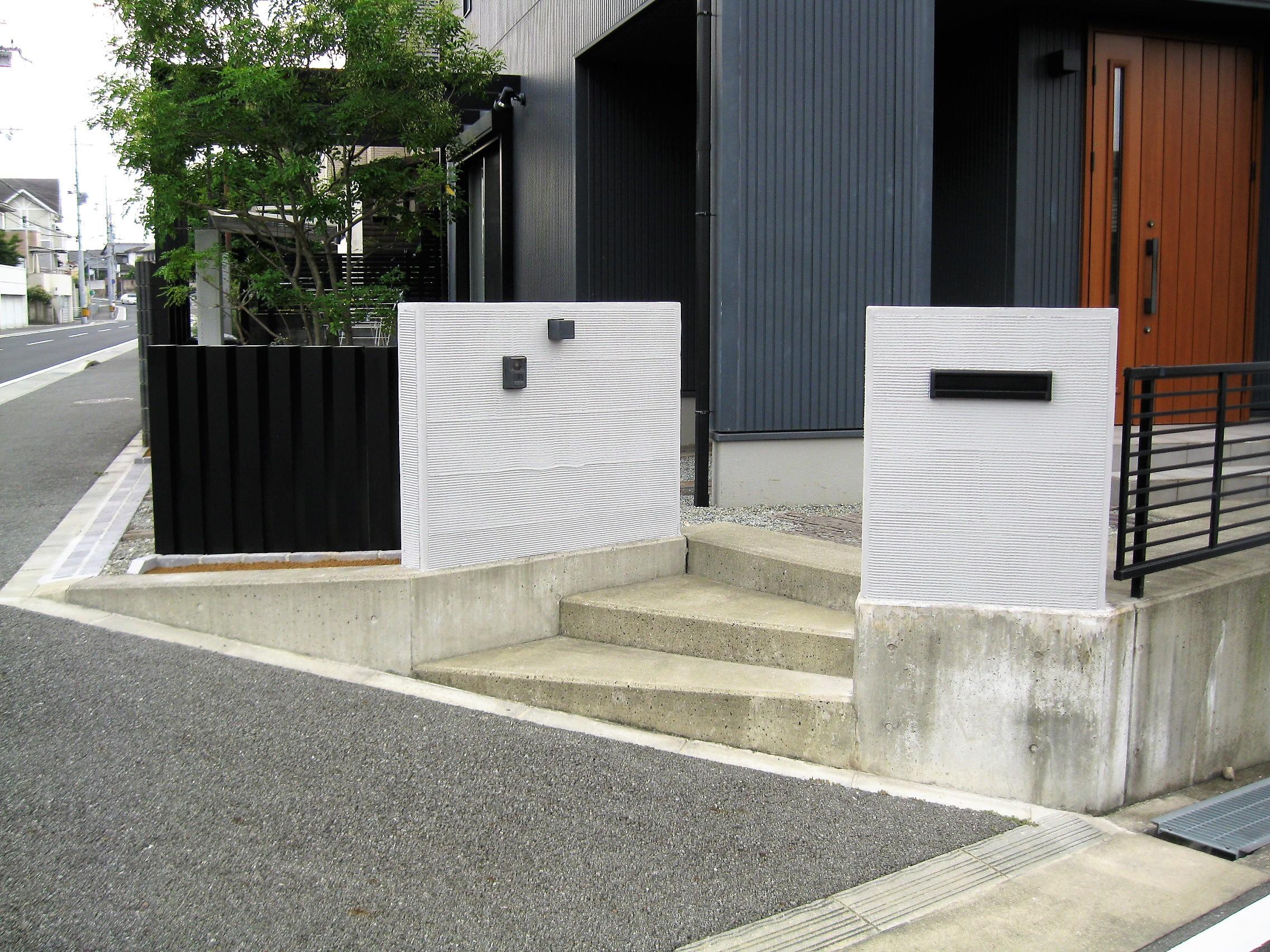 建屋と塀との間がオープンすぎて物足らないとの事でフレームを設置して空間アクセントを設けました。また、既存設置してあった枕木材も腐食が進み取り替えたいとの事でアルミ製の枕木材を設置、経年の汚れが目立ち始めたコンクリート打放し風の塀も下地を整えて化粧材塗りを行い、屋内側からの隣家との目線を防ぐ為に目隠し風のフェンスを少し高目で設置しました。