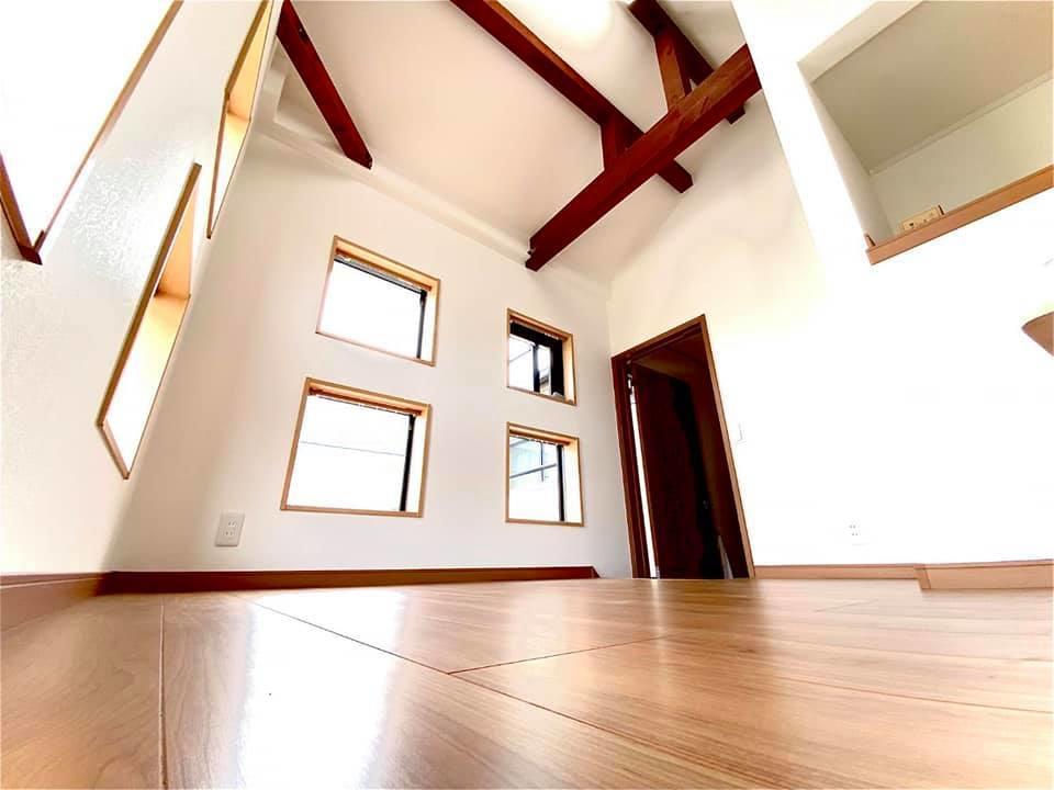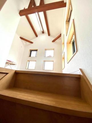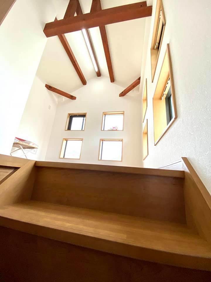 床が上がった分、天上を勾配天井にして、圧迫感を少なくし、構造木材を化粧塗装することによりお洒落な雰囲気に仕上がりました。