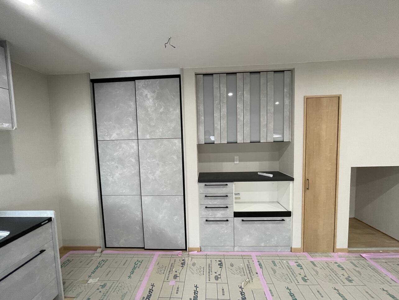 収納スペースにはカップボードと家電タワーを導入し、シンプルで整ったリビングを実現しました。この工夫により、広々とした空間が生まれています。