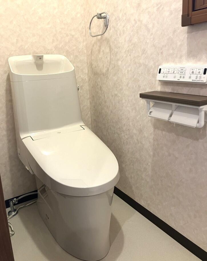 「空間の雰囲気は変えたくない」とのご希望を受け、既存のカラーに近いトイレとクッションフロアを選定。やさしい色合いで、落ち着いた空間に仕上がっています。