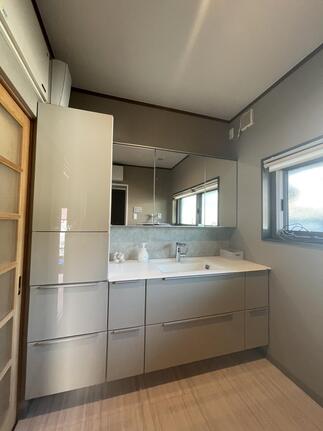 既存の洗面台位置を変更し、収納量をしっかり確保しながら広々とした空間へ。