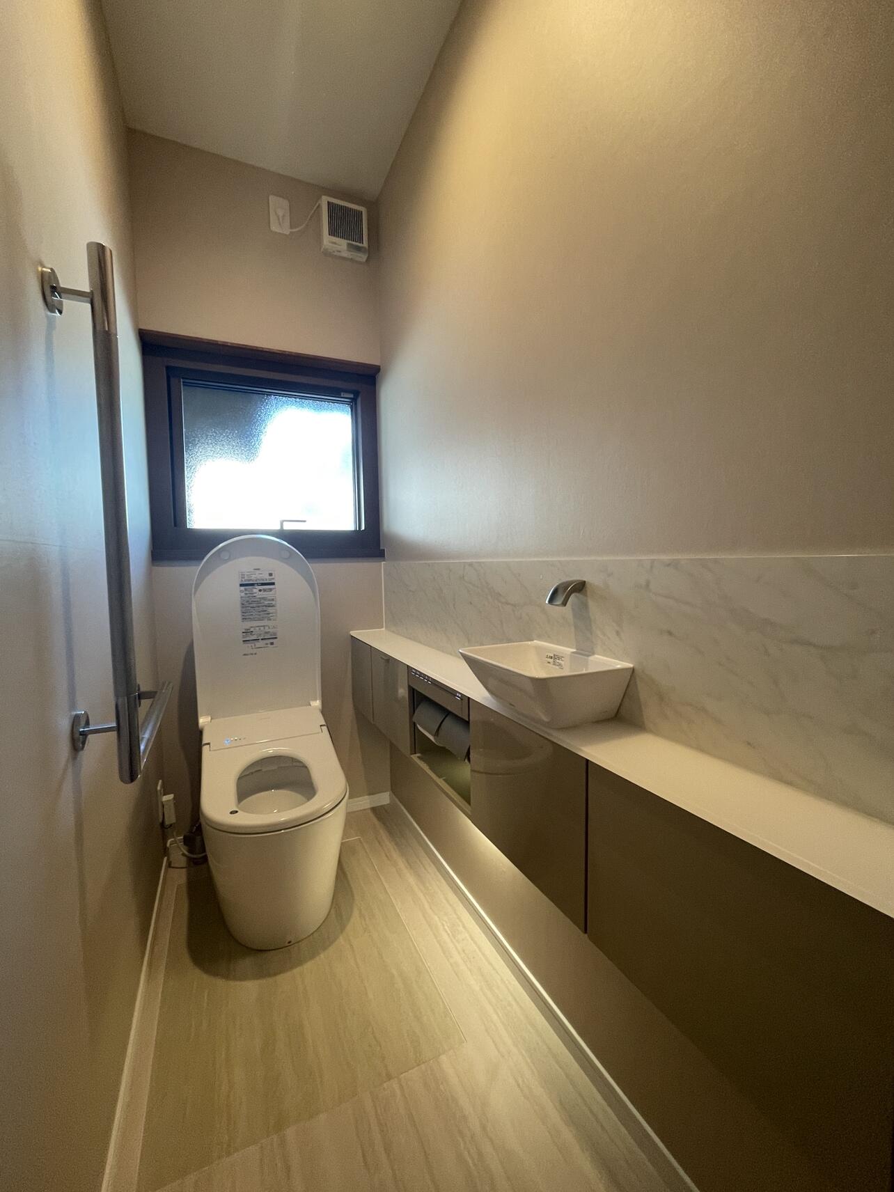 既存の広い間口を活かすため、排水位置を変更してレストルーム全体を上質な空間へとリニューアル。