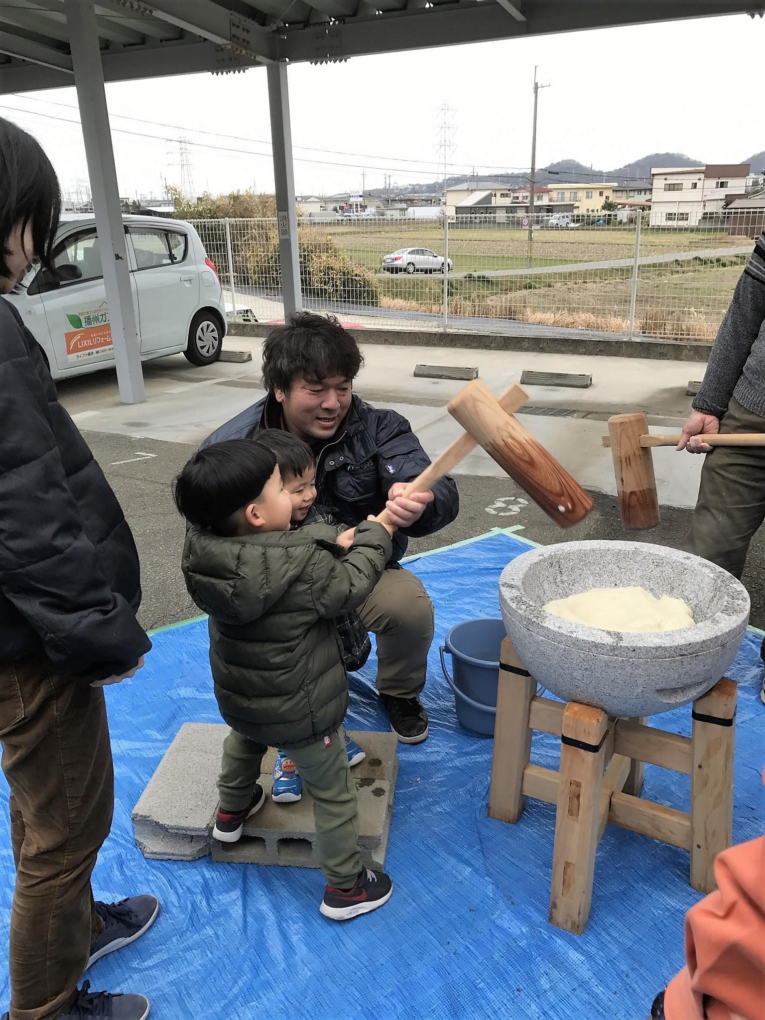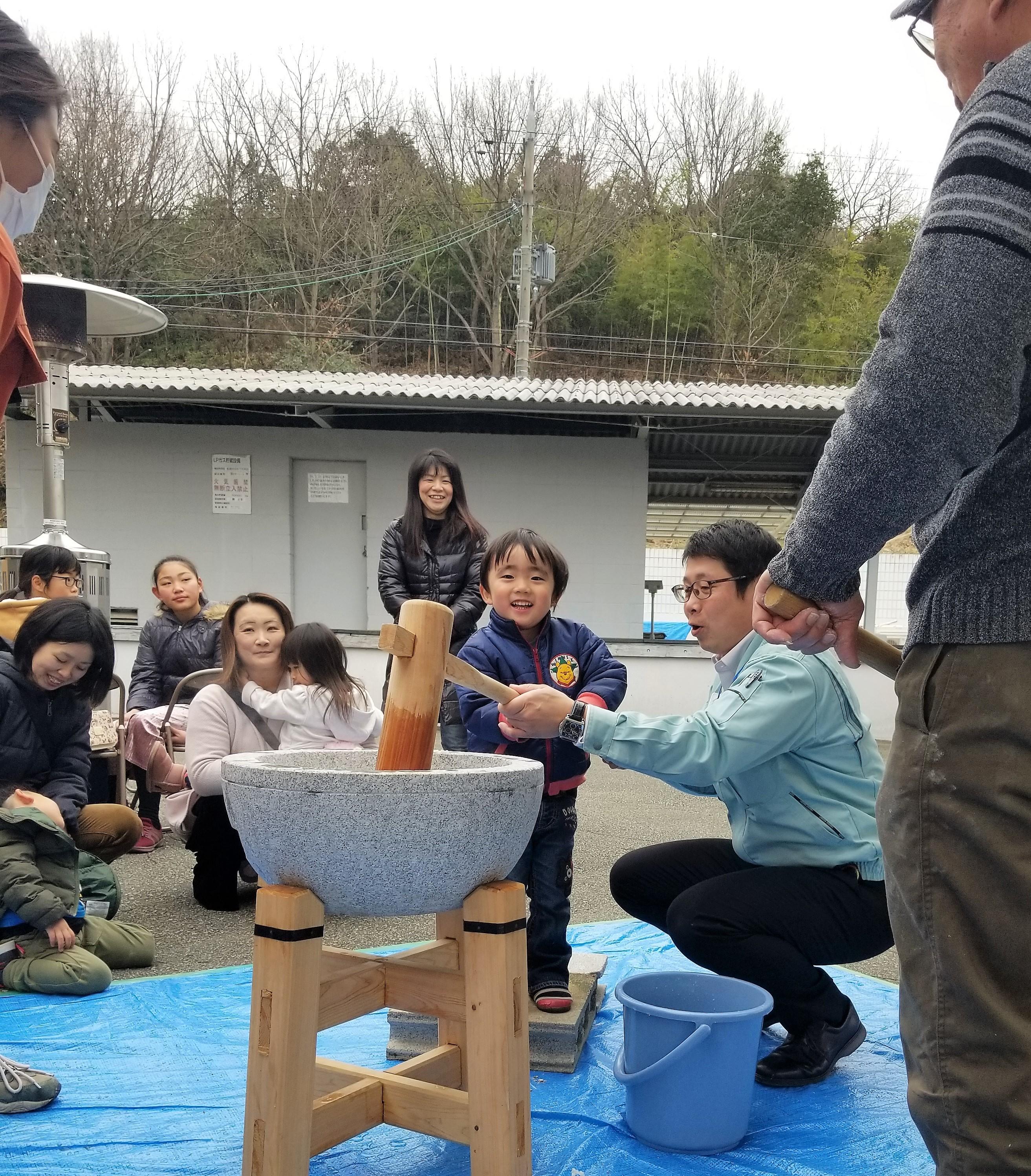 子供達も目の前でペッタンペッタンする姿に興味津々で、重い杵を持ち上げ、一生懸命お餅をついていました。