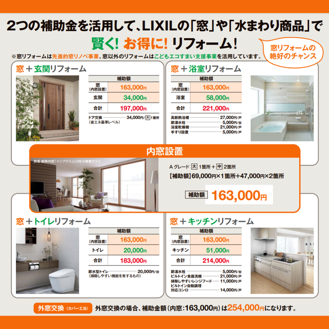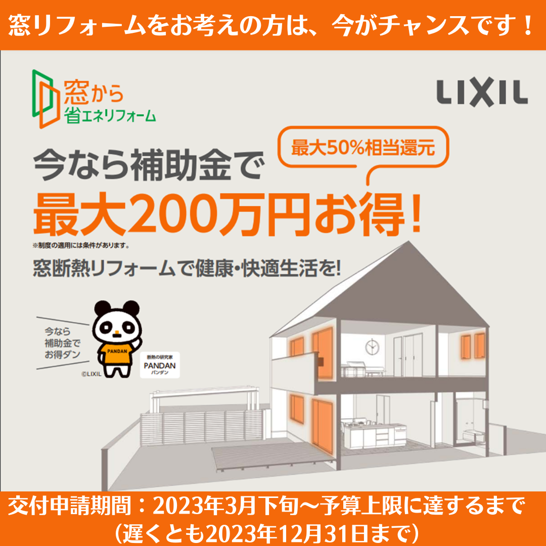 一戸当たり最大200万円、高い断熱性能を持つ窓への改修に関する費用の約1/2相当等が定額補助、窓リフォームに関する補助金制度です。