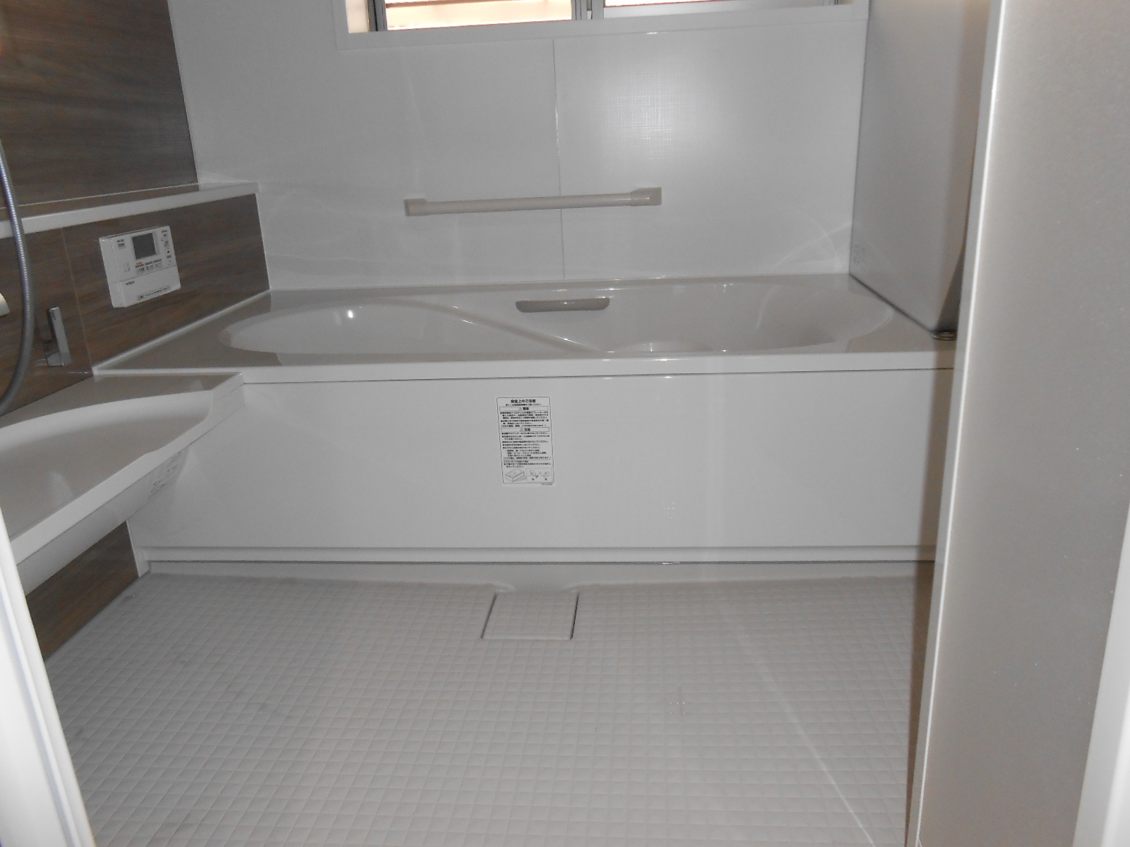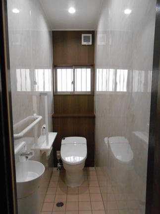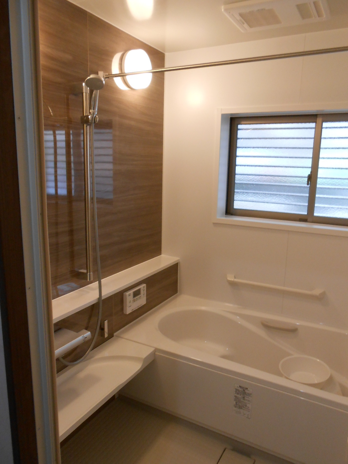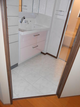 洗面脱衣室 施工後 廊下に斜めに壁と引戸を設けてきちんとした脱衣室ができました。