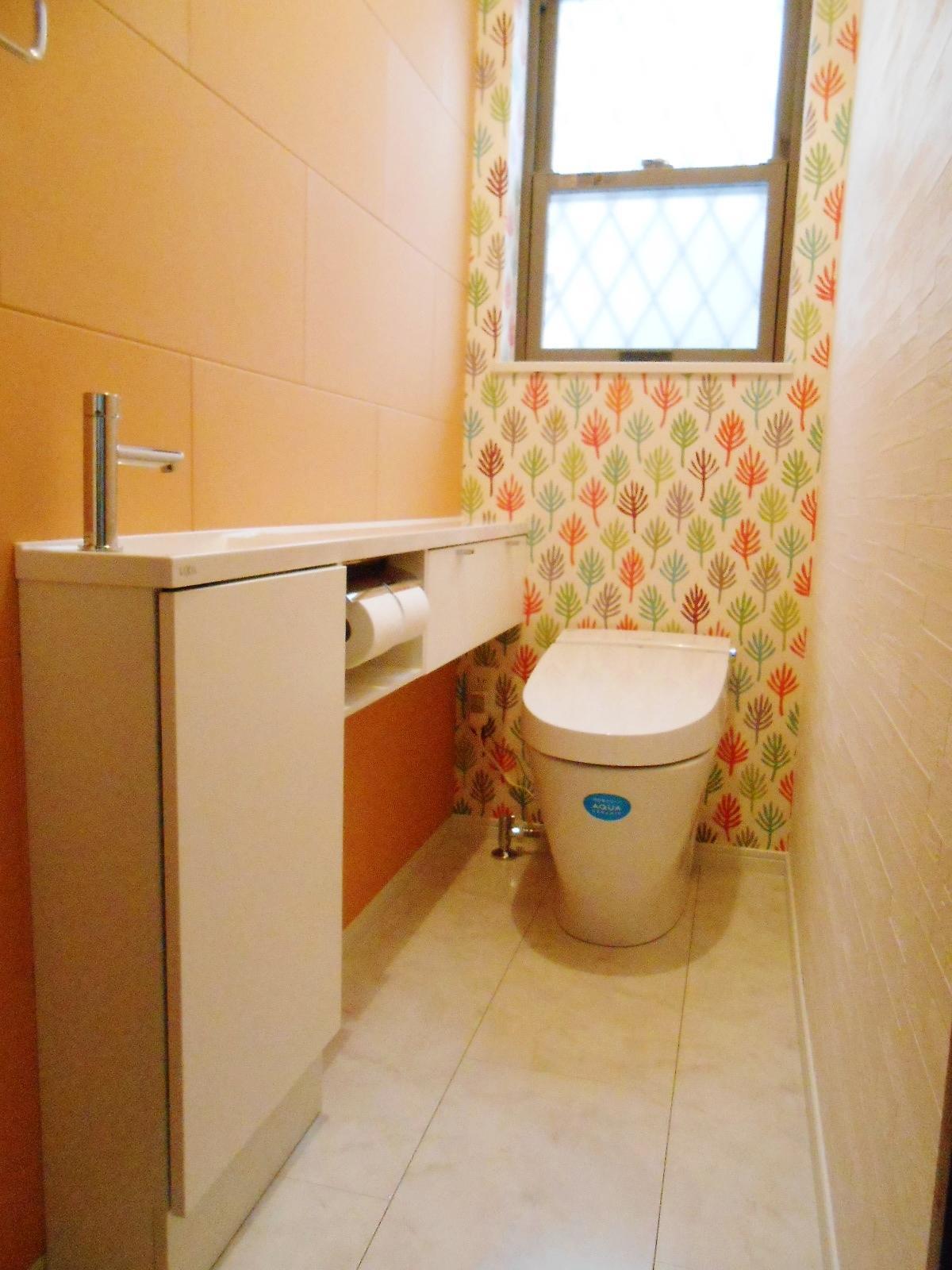 窓側の壁紙と、手洗い側の壁のオレンジ色のエコカラットで明るく暖かな印象のトイレになりました。