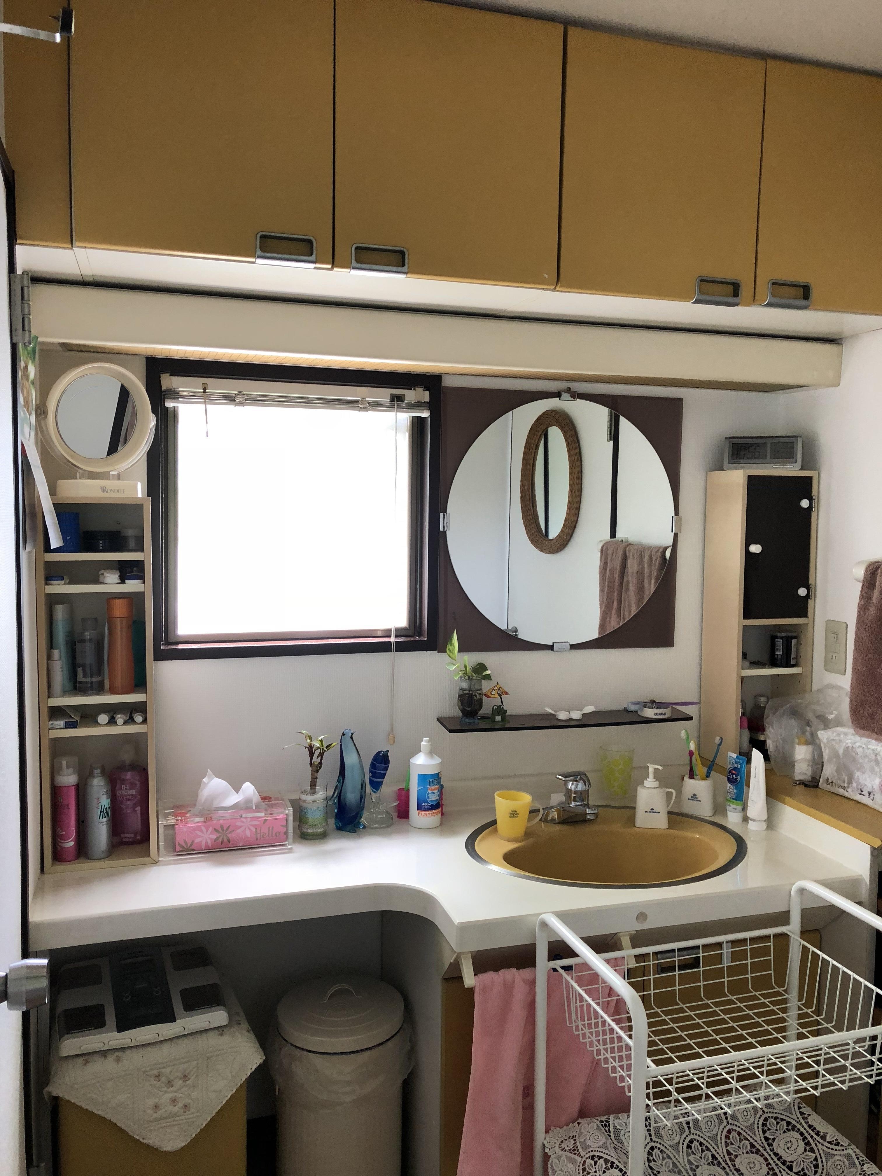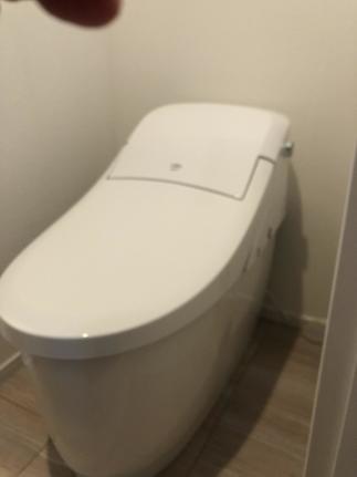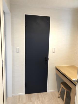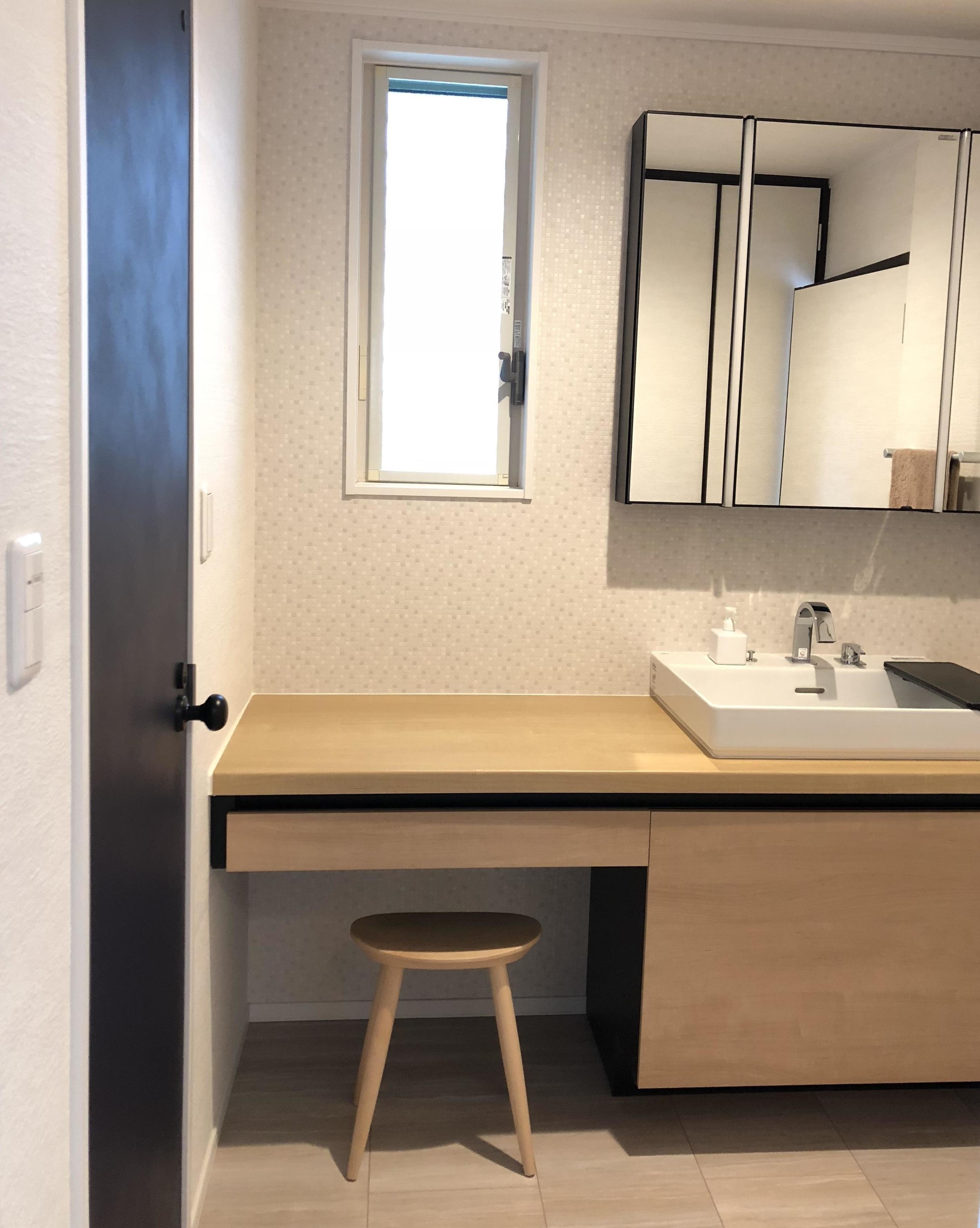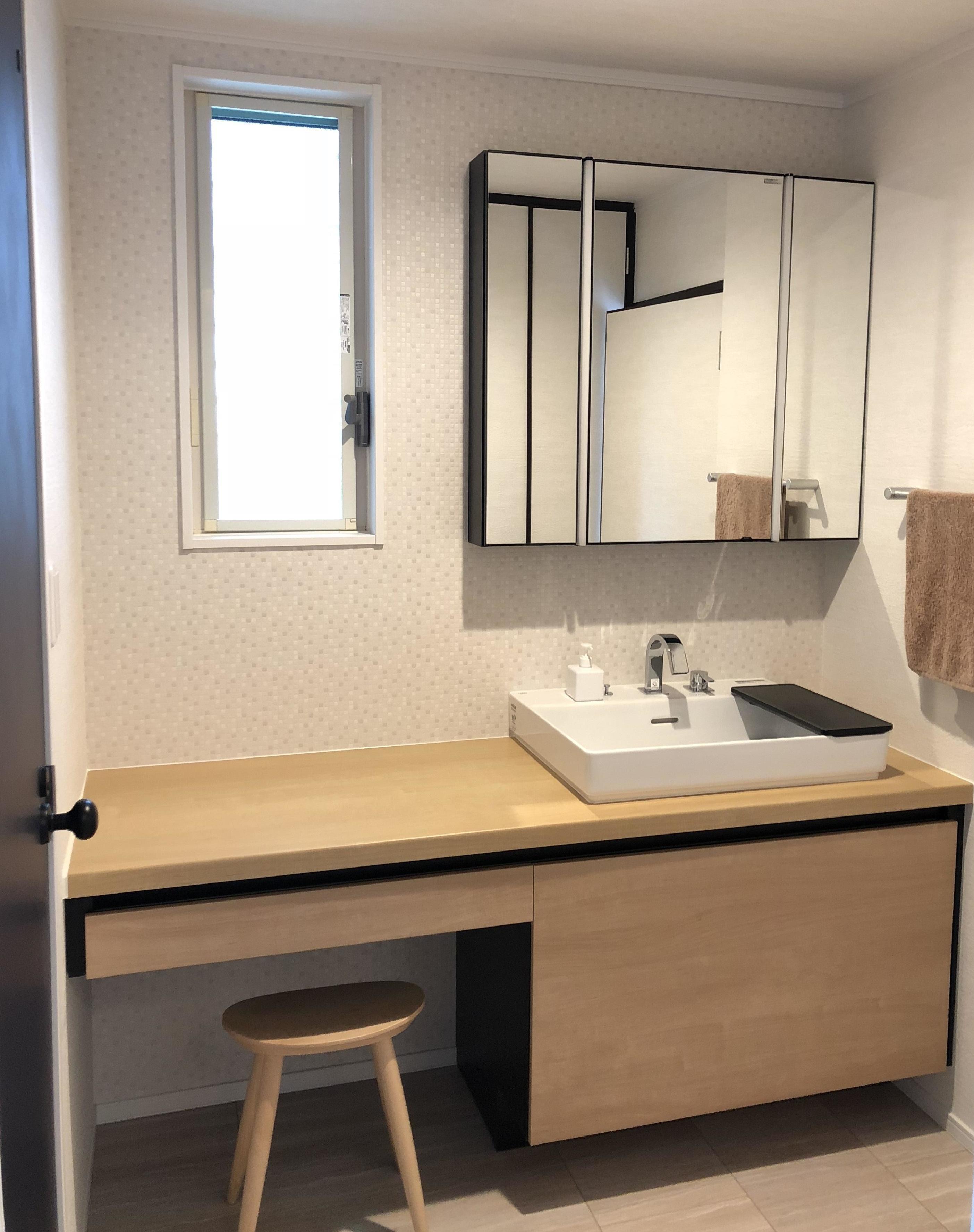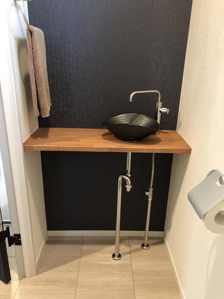 ネイビーブルーのトイレドアや黒の信楽焼の手洗器、ネイビーのクロス、洗面キャビネットカラーの黒。濃色をうまくコーディネートされて、モダンなサニタリースペースが完成しました。